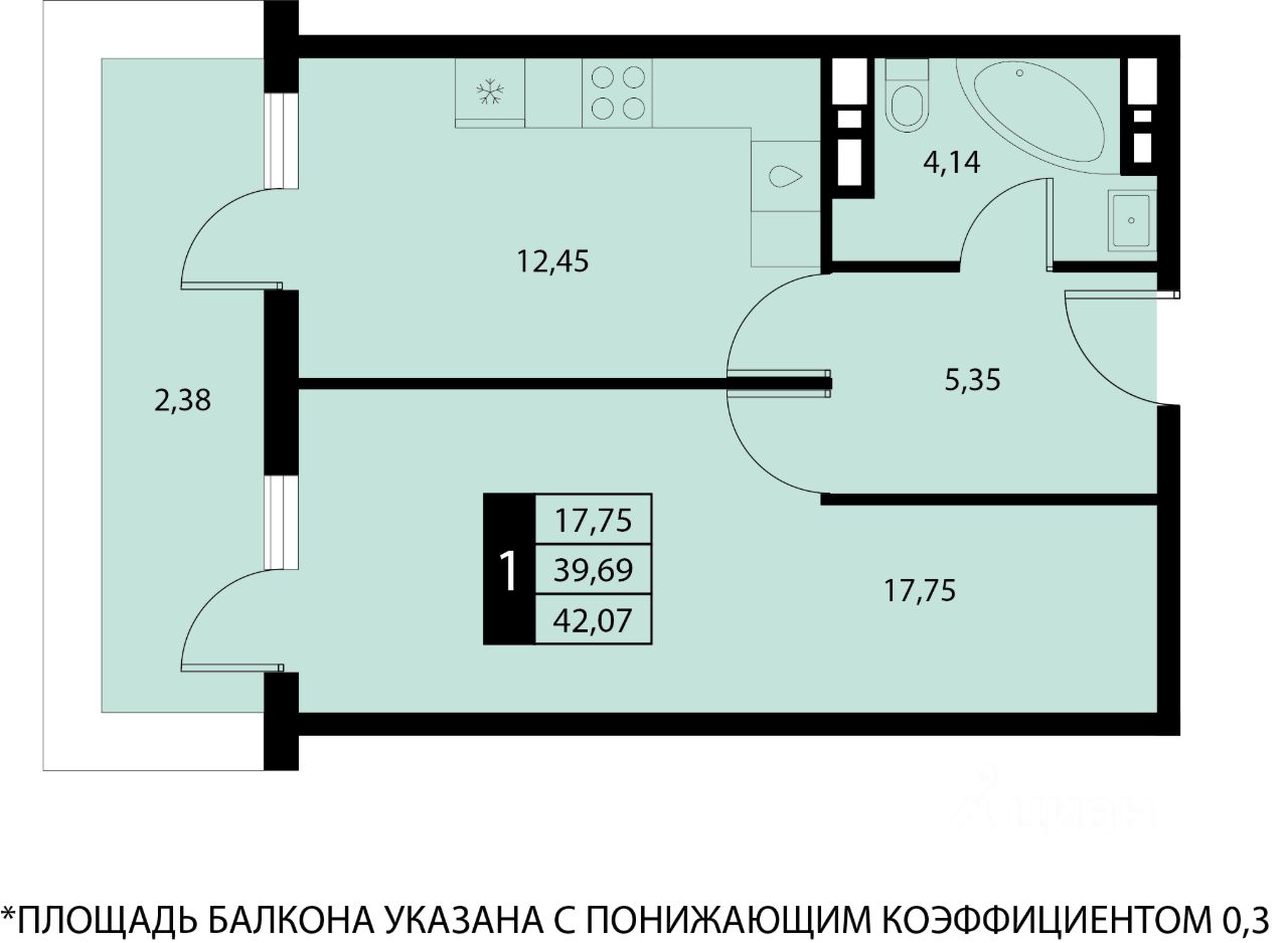Общая площадь42,07 м2