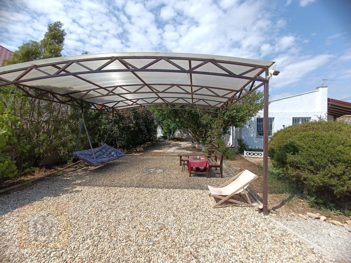 Установлена беседка с живой изгородью из винограда. Навес под две машины.