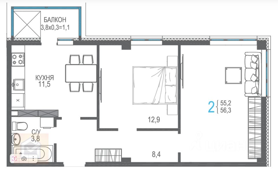 Квартира расположена на 7-м этаже 9-ти этажного дома. Общая площадь: 58,7 м². В квартире: 2 изолированные комнаты - 12.9 м², 18.6 м², просторная кухня - 11,5 м², прихожая - 8,4 м², совмещенный с/у - 3.8 м², балкон - 3,8 м².