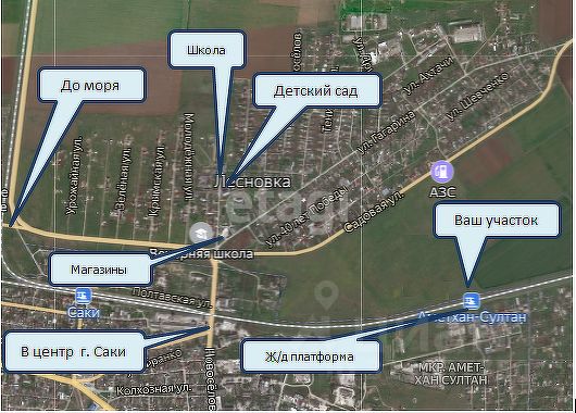 Инфраструктура села включает школу, детский сад, амбулаторию, почтовое отделение и магазины первой необходимости. В пяти минутах езды расположен город Саки, известный своими лечебными грязевыми и минеральными ресурсами. Морское побережье и Розовое озеро доступны за 15 минут на автомобиле, что делает участок привлекательным как для постоянного проживания, так и для летнего отдыха.