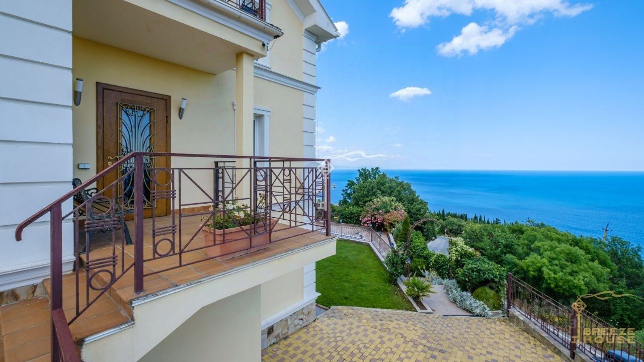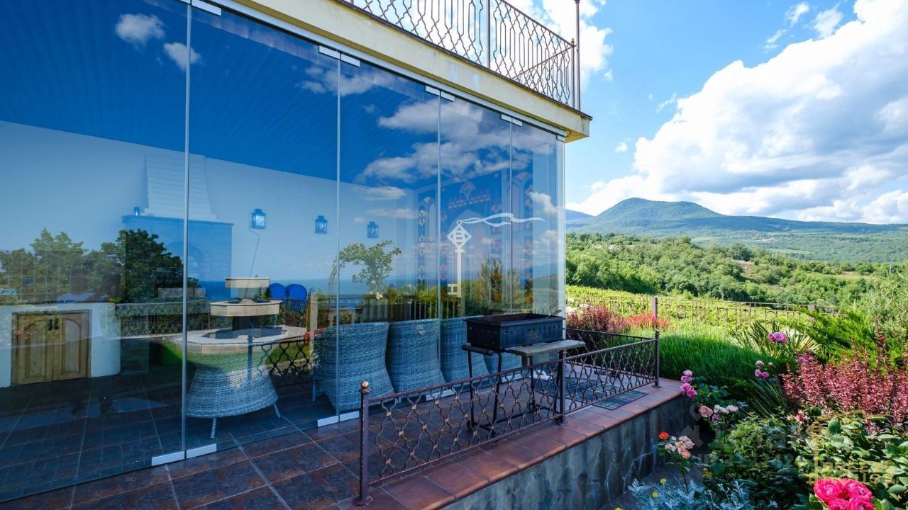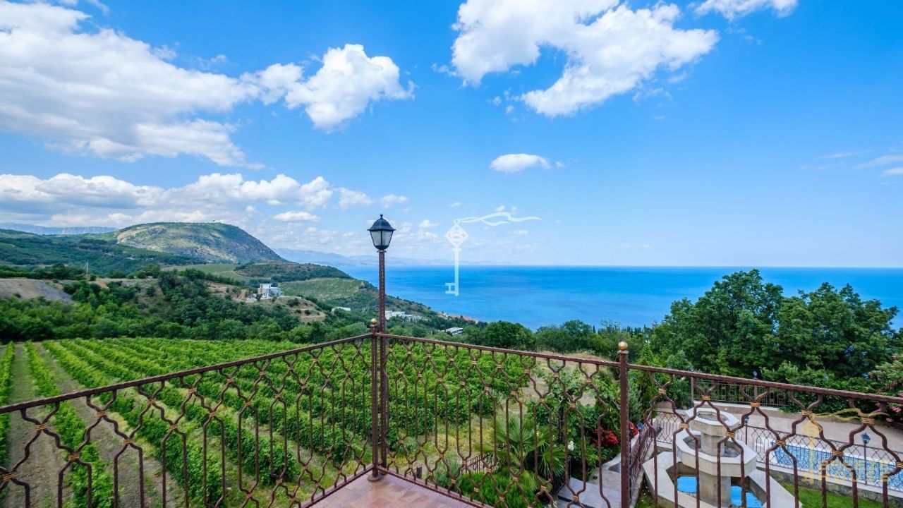 Продажа трехэтажного дома с бассейном и просторными террасами облагороженного каскадным участком 10 соток, с которого открываются необычайной красивые панорамные виды на Черное море, виноградники и даже мыс Меганом.