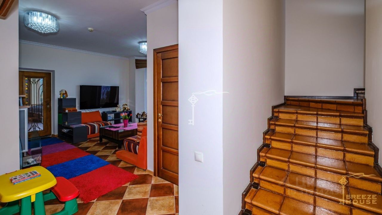 -панорамные оконные системы с французскими балконами и прекрасными видовыми характеристиками, -полы: гостиные - ламинат , санузлы - керамогранит, кухня и цокольный этаж - плитка, -лестница с перилами ручной ковки, -стены - штукатурка и виниловые обои под покраску.