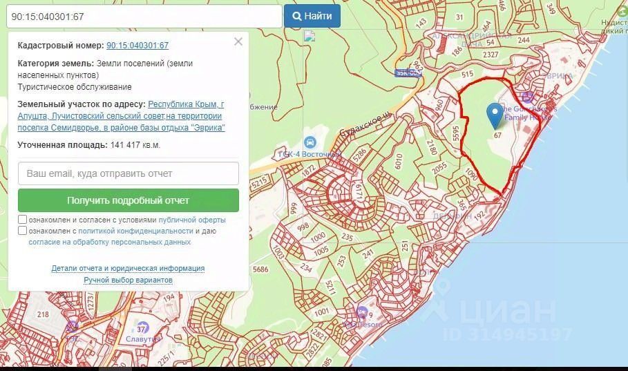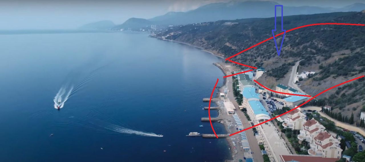 Участок холмистый, что позволяет при строительстве объектов делать их видовыми. На территории есть несколько гостинично- частных зданий, основная территория пустая, чистый не застроенный участок без особых ограничивший и сервитутов. До центра г. Алушты 10-15 минут. Коммуникации: мощности есть, под проект согласуют. В данный момент участок образует новые границы, уже без зданий, гостиниц, домов и строений. Новый образованный размер +-10 Га. Аренда участка 14 Га до 2054г.(3,2 милл.руб/год) Пляжная зона в аренде. Строительная площадка из предварительных расчетов составит 25-30 000 кв.м., можно больше, в зависимости от вашего проекта до 68 000 кв.м.