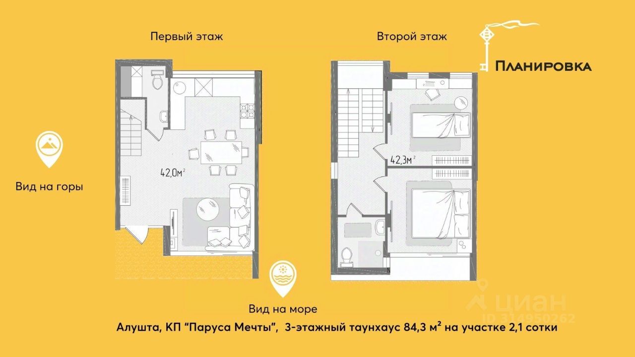 Потрясающие видовые характеристики одно из главных преимуществ в поселке ''Паруса мечты''. Архитектура поселка продумана и встроена в местность так, что из панорамных окон абсолютно всех домов открывается захватывающий дух вид на искрящееся море, густой лес и величественную гору Кастель. Эти пейзажи по-разному прекрасны в каждое время года: весной и летом это буйство всех оттенков зеленого, а осенью целая палитра цветов от янтарного до насыщенного красного.