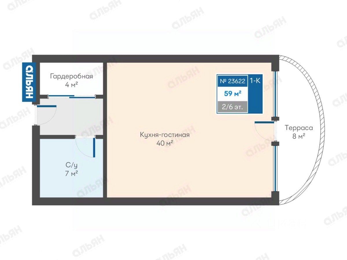 Гардеробная 4 м2, терраса 8 м2, кухня-гостиная 40 м2, санузел 7 м2.