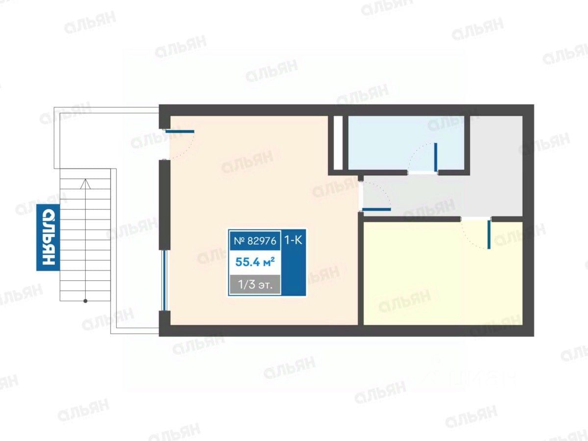 Находится на 1 этаже 3-этажного дома. Общая площадь 55,4 м2.