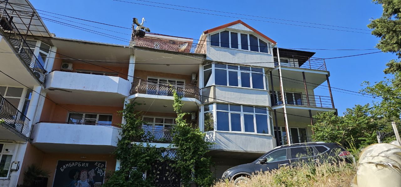 Здание в четыре этажа: первый из них используется под хранение автотранспорта, второй и последующие предусмотрены для проживания. Имеется преддомовая территория, отдельный вход. Выполнены фасадные работы, остекление, перекрытие ( металлочерепица). Несущие стены: железобетон. Наполнение стен: крымский ракушечник. Всё стены в предчистовой отделке.