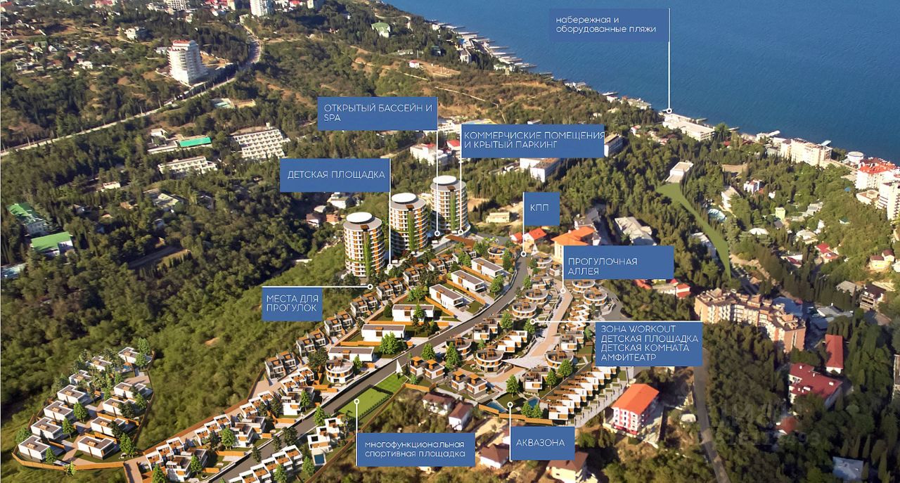 Инфраструктура и транспортная доступность: -Круглосуточное видеонаблюдение и охрана на территории комплекса - Своя инфраструктура внутри комплекса-все сервисы можно найти на первых этажах: кафе, ресепшен с лобби-баром, прачечная и камера хранения, открытый кинотеатр, детские площадки, тренажерный зал, открытый и закрытый бассейны - Жителям комплекса также будет доступна опция проезда на электрокаре - можно быстро и с комфортом добраться до центра Алушты или до собственного пляжа - Комплекс апартаментов находится в одном из самых живописных и экологически чистых мест Крыма, в Профессорском уголке — это крупнейший горный заповедник на территории полуострова - Рядом курортные, туристические и уникальные природные локации: Гора Кастель, крепость Алустон, Алуштинский дельфинарий, Аква-парк Миндальная Роща - В 12 минутах ходьбы благоустроенные пляжи Алушты и самая длинная 7-километровая набережная в Крыму с курортной инфраструктурой - Алушта находится в центральной части Южного берега Крыма, всего в 25 км от Ялты и в 37 км от Симферополя