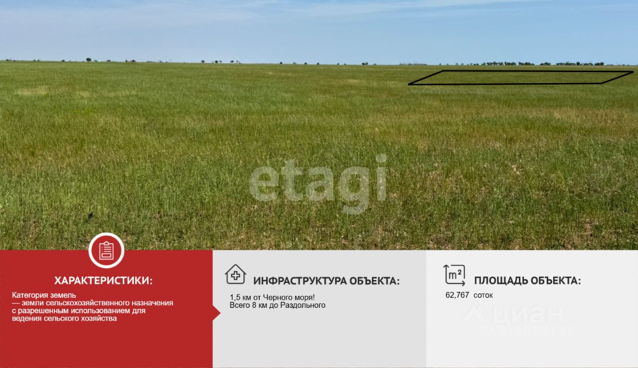 Особое внимание стоит уделить расположению участка: 1,5 км от Черного моря! Всего 8 км до Раздольного, что открывает широкие возможности для бизнеса и туризма.