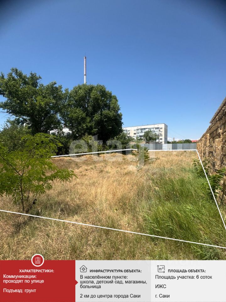 Участок площадью 6 соток расположен в тихом районе города Саки, вблизи городской больницы. Территория имеет правильную прямоугольную форму (2030 метров), что упрощает планировку будущего строительства. Участок полностью подготовлен для жилого использования, коммуникации проходят вдоль улицы. Район отличается развитой инфраструктурой — в шаговой доступности находятся магазины, остановки общественного транспорта и медицинские учреждения. Центр города находится в 2 км, что составляет около 20 минут пешей прогулки, а до объездной дороги — всего 500 метров, что обеспечивает удобный выезд на основные транспортные магистрали.