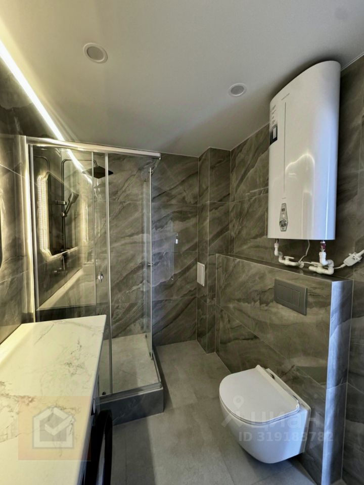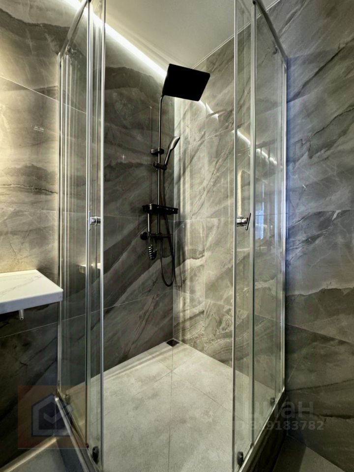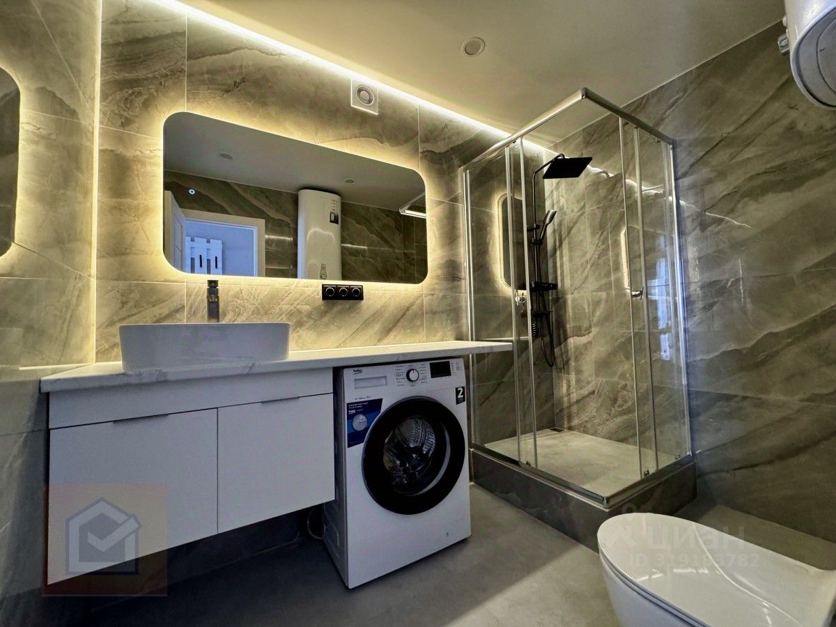 Дизайн и ремонт: • Современный евроремонт с продуманной планировкой • Стильные однотонные обои, ламинат премиум-класса (имитация под бетон) • Керамогранит 12060, инсталляция, тропический душ • Белые натяжные потолки со встроенными карнизами и светодиодной лентой • Трековое освещение на кухне и множество светильников по всей квартире • Кухня выполнена на заказ, установлена вся техника и мебель