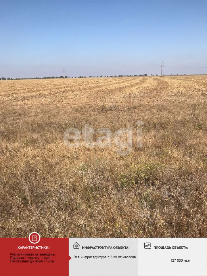 Продается земельный массив сельхозназначения площадью - 1270 соток, с плодородной почвой, расположен на Западном побережье Крыма в Сакском районе (пригород г.Евпатория). Расстояние до центра Евпатории - 10 км по асфальтированной дороге.