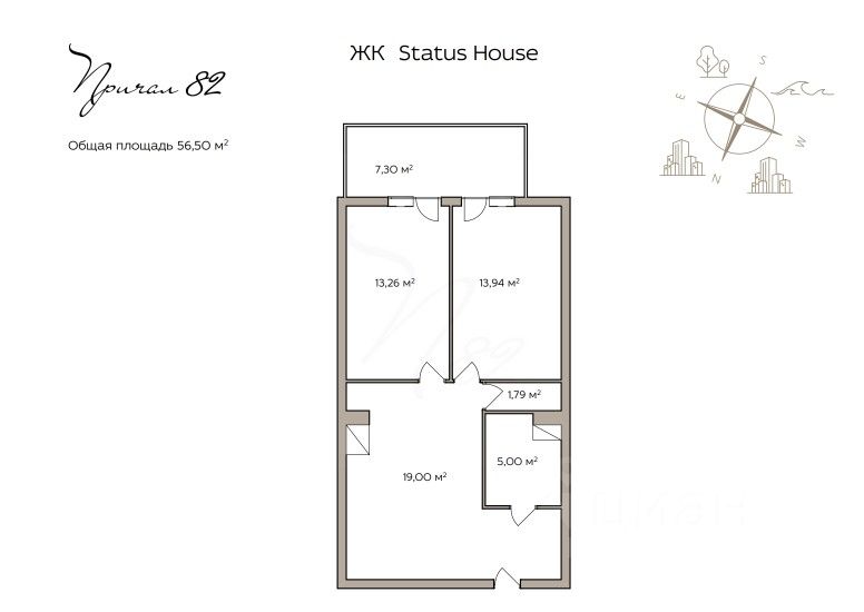 Общая площадь 56,5 кв.м., планировка включает зону прихожей 3,6 кв.м., кухню-столовую 19,0 кв.м., две спальни 13,3 кв.м. и 13,5 кв.м., два сан.узла - 5,0 кв.м. и 2,1 кв.м., просторный балкон 7,3 кв.м. (не включен в общую площадь). Расположена на 5м этаже.