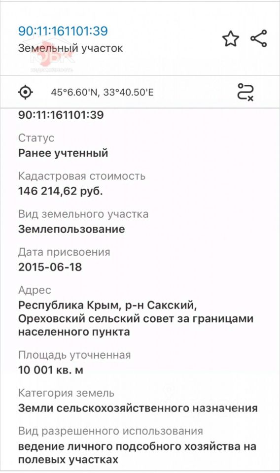 **Юридический статус:** Участок имеет статус личного подсобного хозяйства, что открывает перед вами широкие возможности для реализации ваших идей. Кадастровый номер 90:11:161101:39 подтверждает его юридическую чистоту и готовность к оформлению сделки.