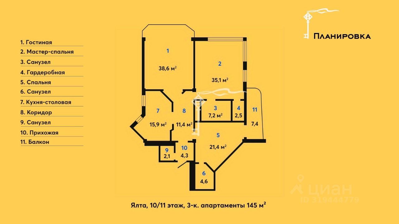-Светлая гостиная с панорамным видом на море, горы и Ялту, -Просторная кухня-столовая, идеально подходящая для семейных завтраков и уютных ужинов, -Мастер-спальня с собственной ванной комнатой и гардеробной, -Вторая спальня с выходом на балкон, собственным санузлом и потрясающим морским видом, -Гостевой санузел и прихожая.
