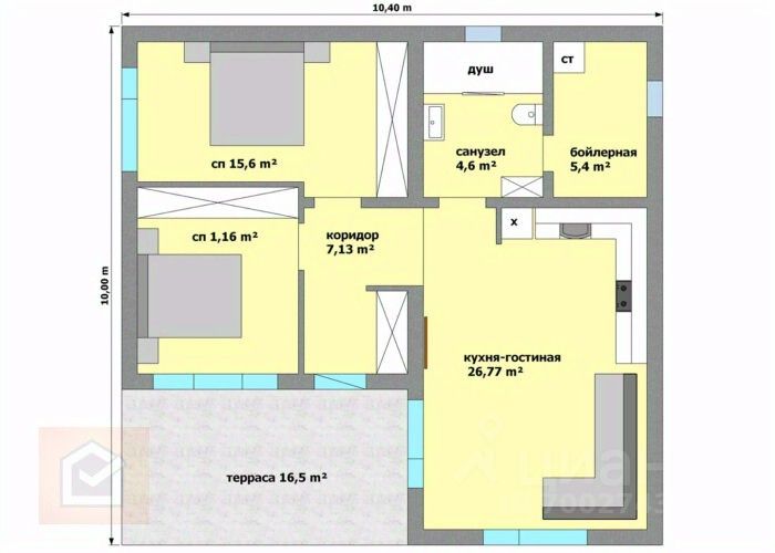 Характеристики: Размеры дома по фундаменту: 10*10,4м 2 комнаты, Кухня-гостиная, Санузел, Бойлерная, Прихожая, Терраса Фундамент: бетон м250 Материал стен: газоблок или ракушка* Колонны, армопояс,перемычки: бетон м250 Кровля: балки и стропила 150*50мм, профлист 0,45мм, утеплитель 150 мм минвата Внешняя отделка: утеплитель пенопласт 5 см, штукатурка ''короед'', покраска. Доступно 2 варианта планировки