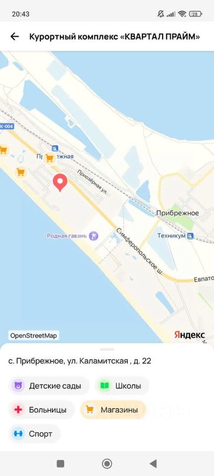 Район активно развивается: здесь строятся новые школы, детские сады и магазины, что создаёт все условия для комфортной жизни. Комплекс ''Прибрежный'' позиционирует себя как бальнеологический круглогодичный курорт, предлагающий лечение с использованием знаменитых ''Сакских грязей'', что делает его идеальным местом для оздоровления и восстановления.