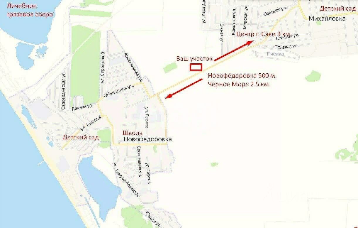 Земельный участок площадью 50 соток (ЛПХ) расположен в Сакском районе Западного Крыма, на первой линии между поселками Новофедоровка и Михайловка. Участок ровный, оформлен в собственность, проведено межевание с уточнением границ. (Состоит из 5 участков по 10 соток).Главное преимущество — близость к Черноморскому побережью: до набережной всего 3 км, а до центра Новофедоровки — 800 метров. Поселок предлагает развитую инфраструктуру: школу, детский сад, храм, аптеки, магазины, а также благоустроенную набережную с кафе и зонами отдыха.