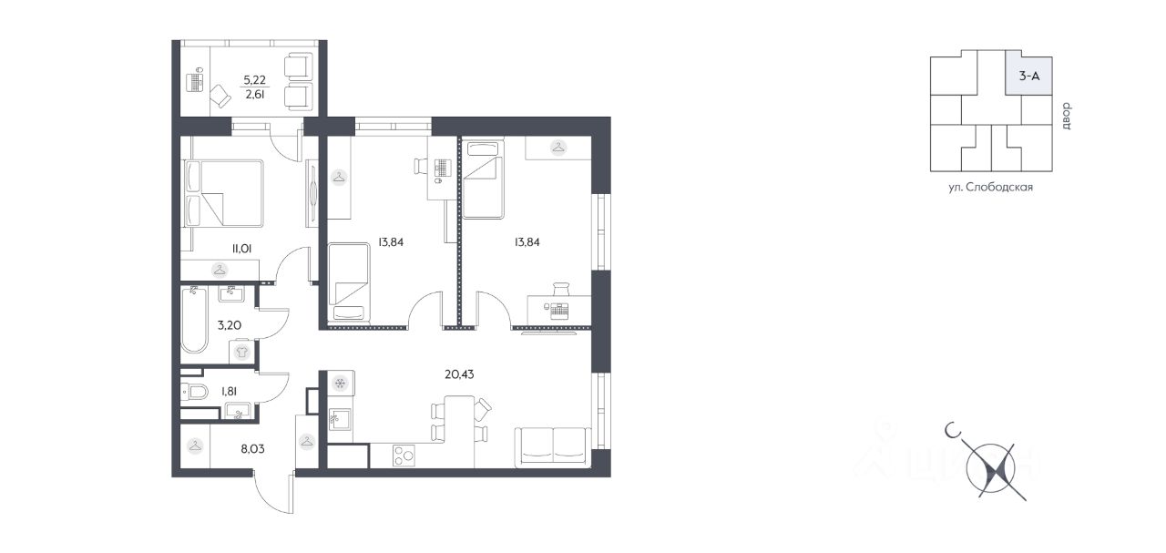 Общая площадь74,77 м2
