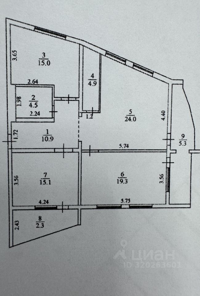 Общая площадь квартиры составляет 93,7 (109 кв. м. с лоджиями) из которых 58,4 кв. м — жилая площадь, а кухня занимает целых 15 кв. м. Квартира находится на 6 этаже 10-этажного дома.