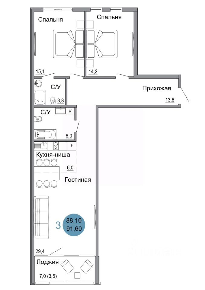 Общая площадь91,6 м2