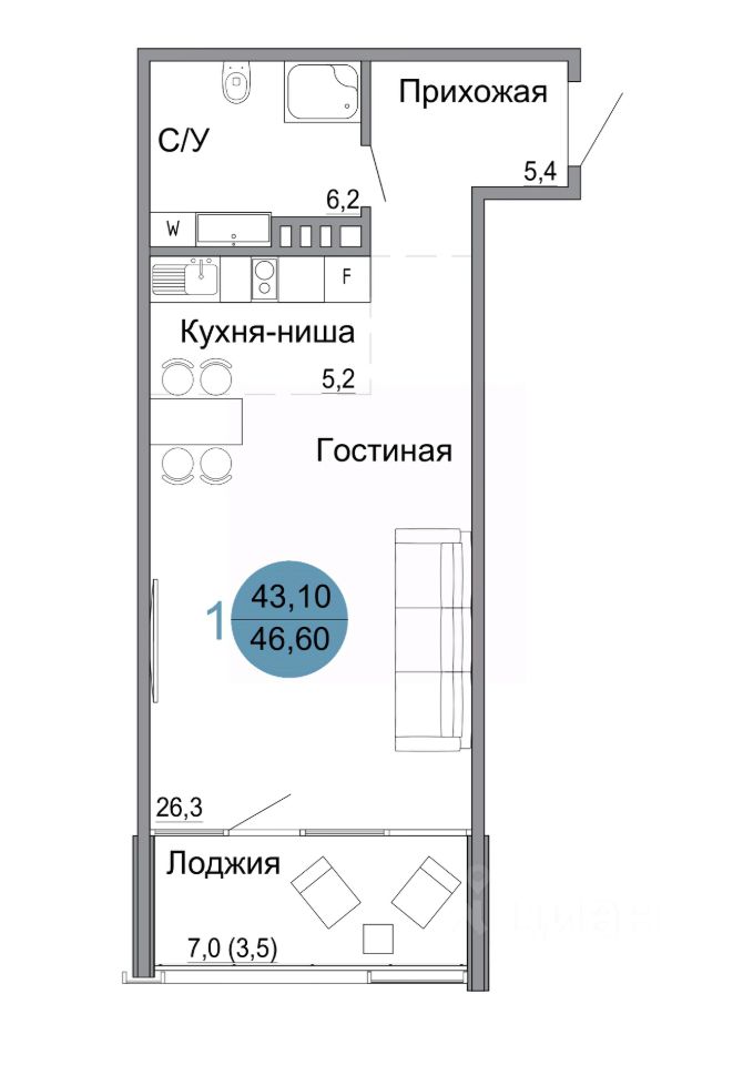 Общая площадь46,6 м2