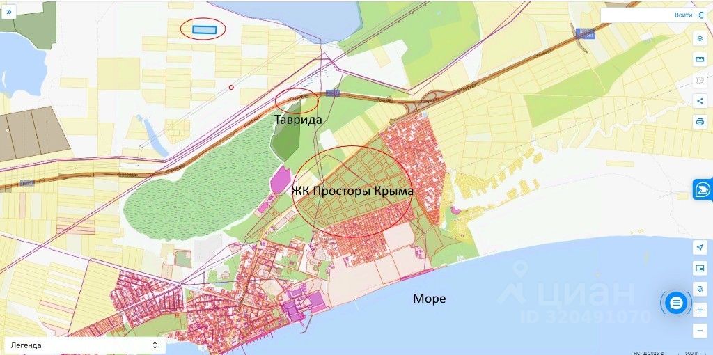 Площадь 5.4 гектар. Расположенный рядом с поселком Приморское, с активно развивающимся микрорайоном ''Аджиголь'' и новым жилым комплексом ''Просторы Крыма'', всего в 6 км от центра поселка и центральной набережной.