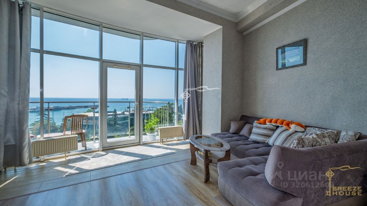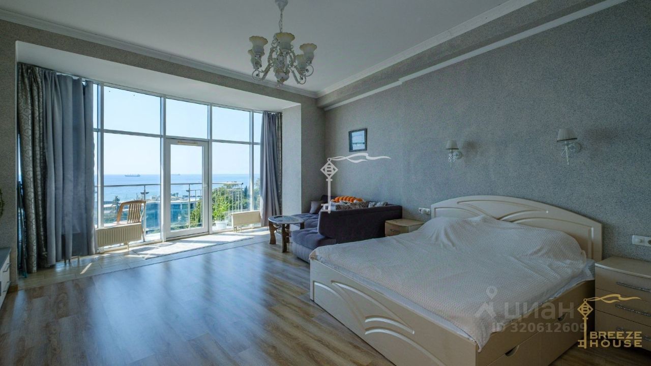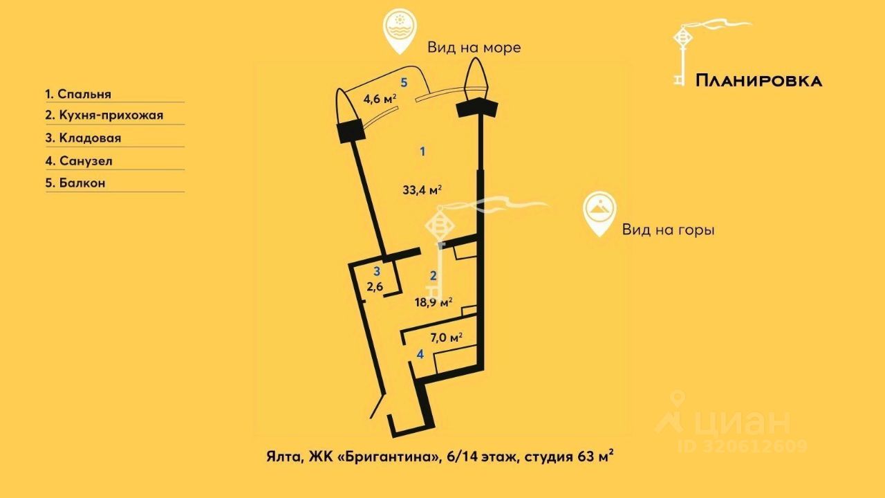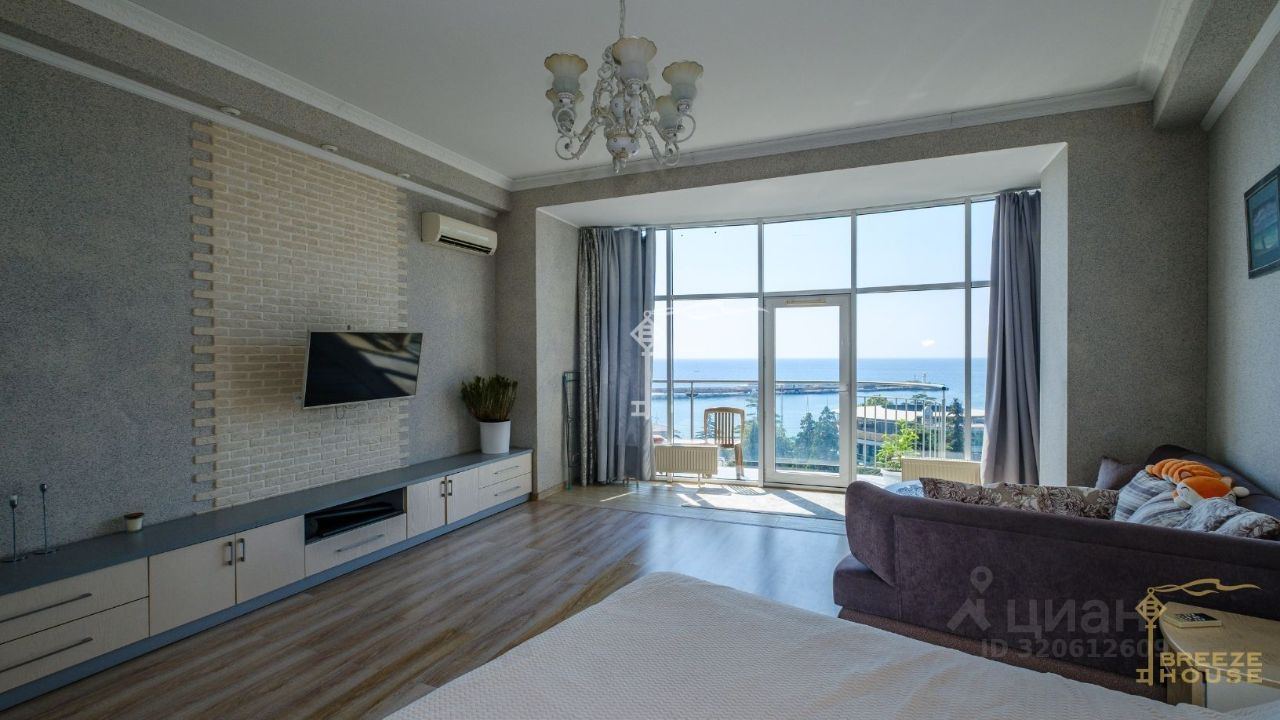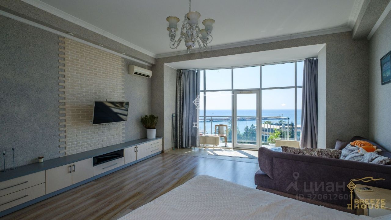 Квартира расположена на шестом этаже 14-этажного здания и имеет балкон с прямым видом на море и Ялтинскую бухту.