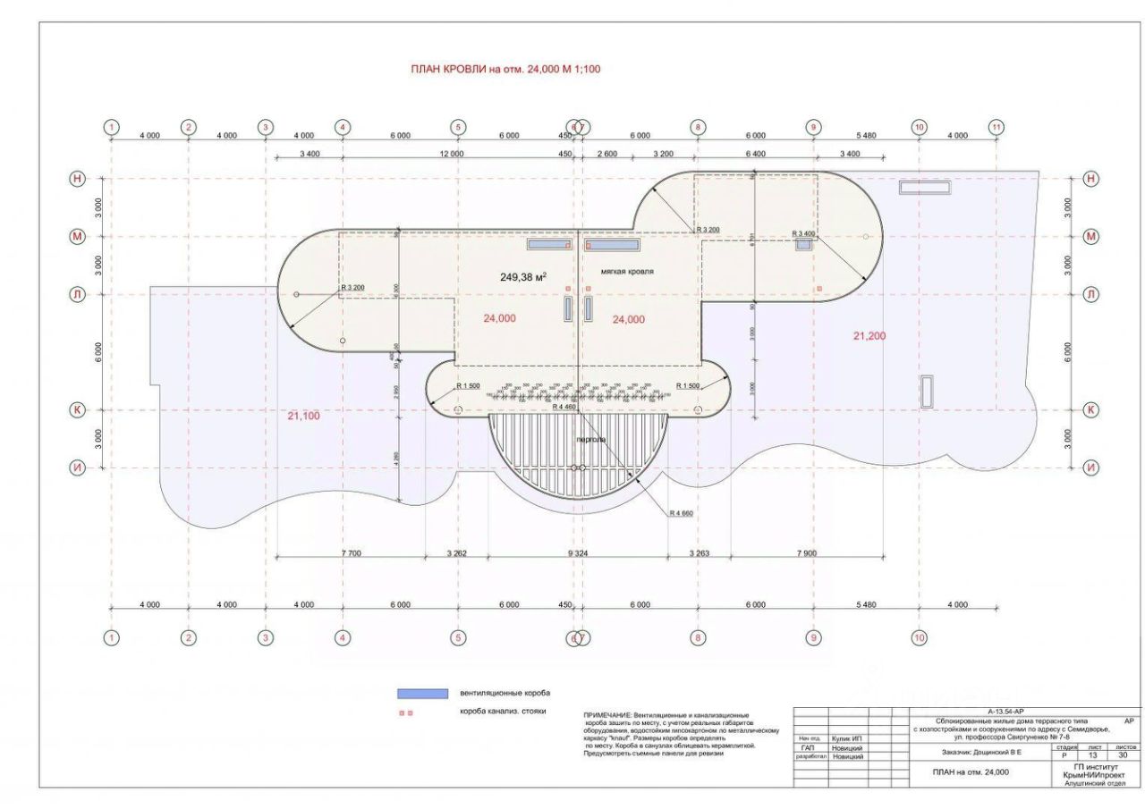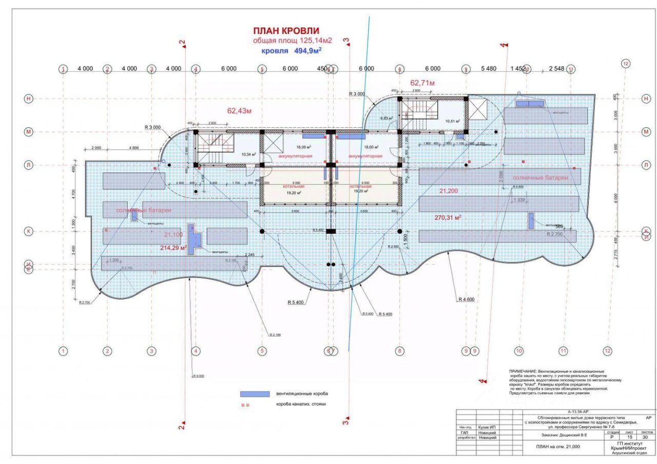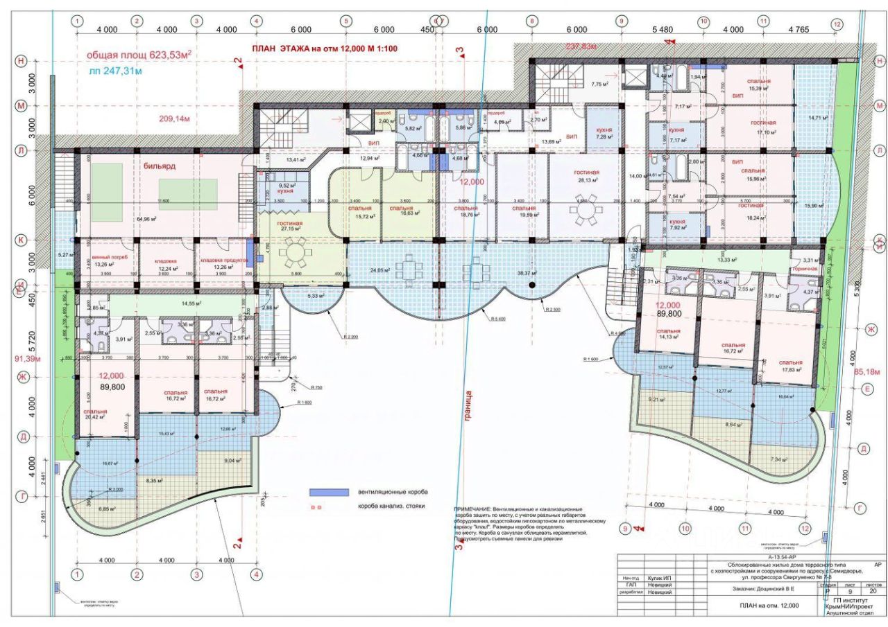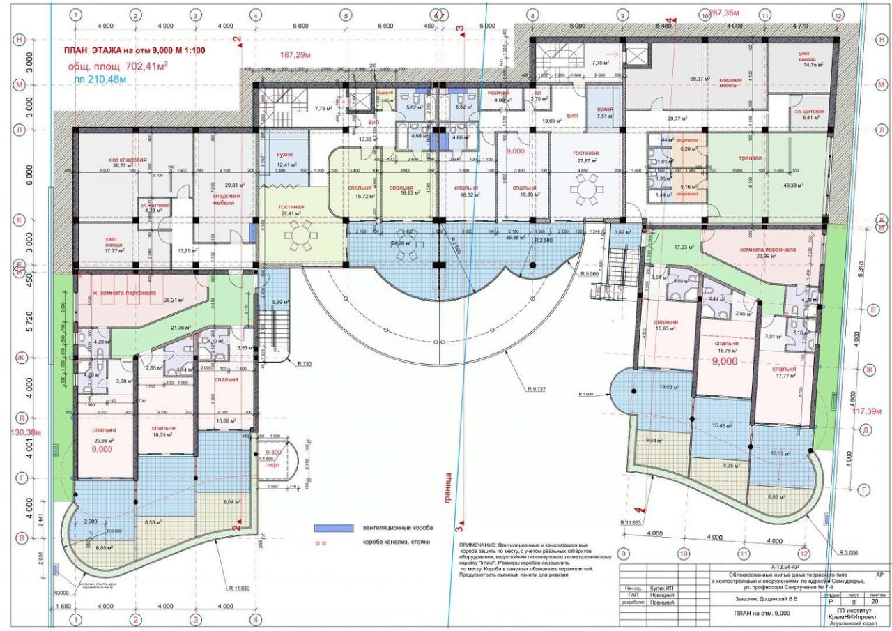 Общая площадь строительства : 6660.36 кв.м . Наземная площадь : 0.3 га . Строительный объем : 15 000 кв.м . Общая площадь : 3500 кв.м . Площадь застройки: 1587 кв.м . Жилая площадь: 1780 кв.м . Площадь летних помещений (террас, балконов) : 1354.05 кв.м .