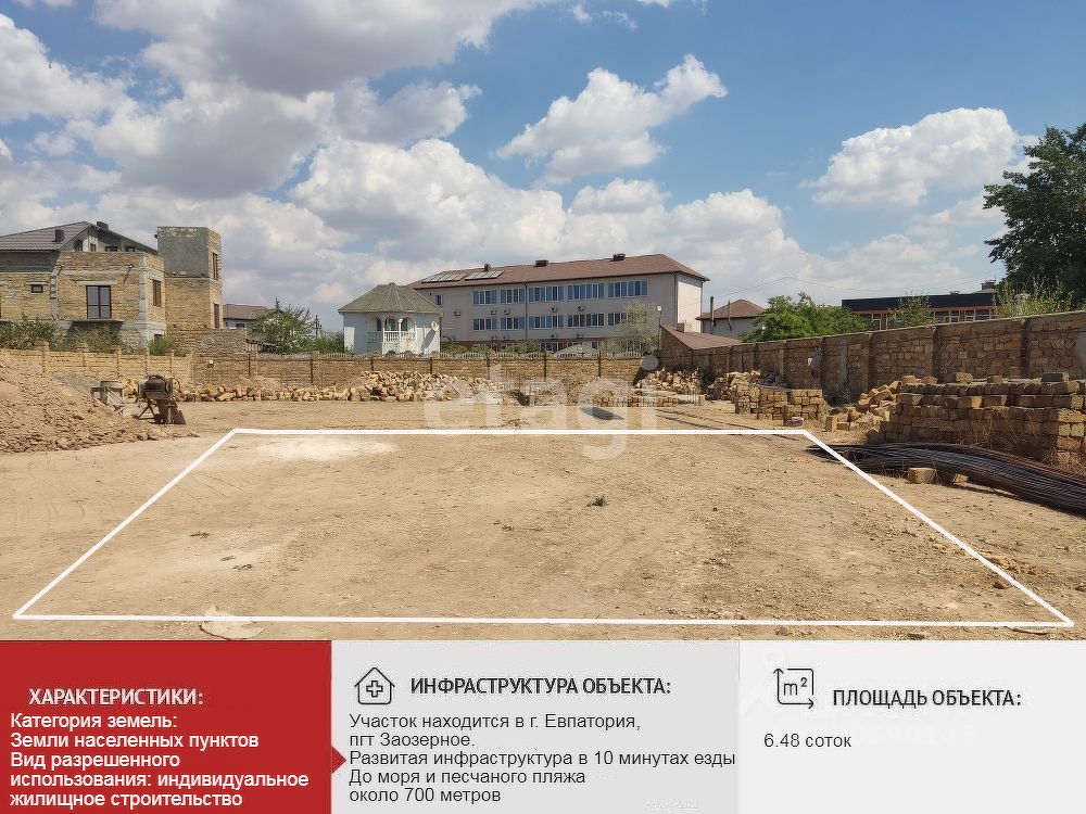 До моря и песчаного пляжа около 700 метров. Участок расположен в перспективно развивающемся районе пгт Заозерное. Идет активная застройка, имеются соседи. Земельный участок ровный, огражден. Электричество на участок заведено. Газ на участок заведен.Получены техническое условия на подключение к сетям водоснабжения и водоотведения. Асфальтированная дорога. В 10 минутах езды до города Евпатории.