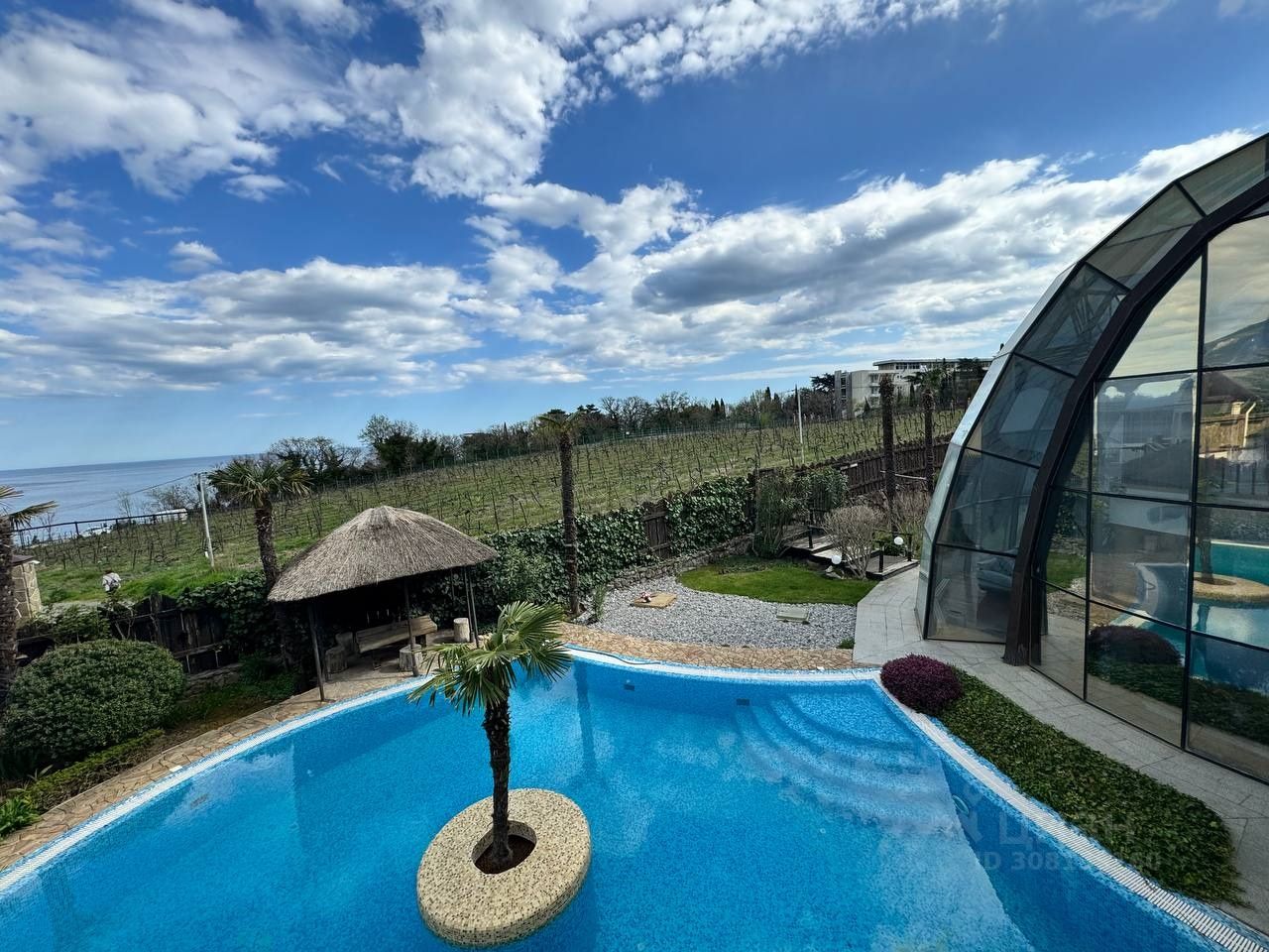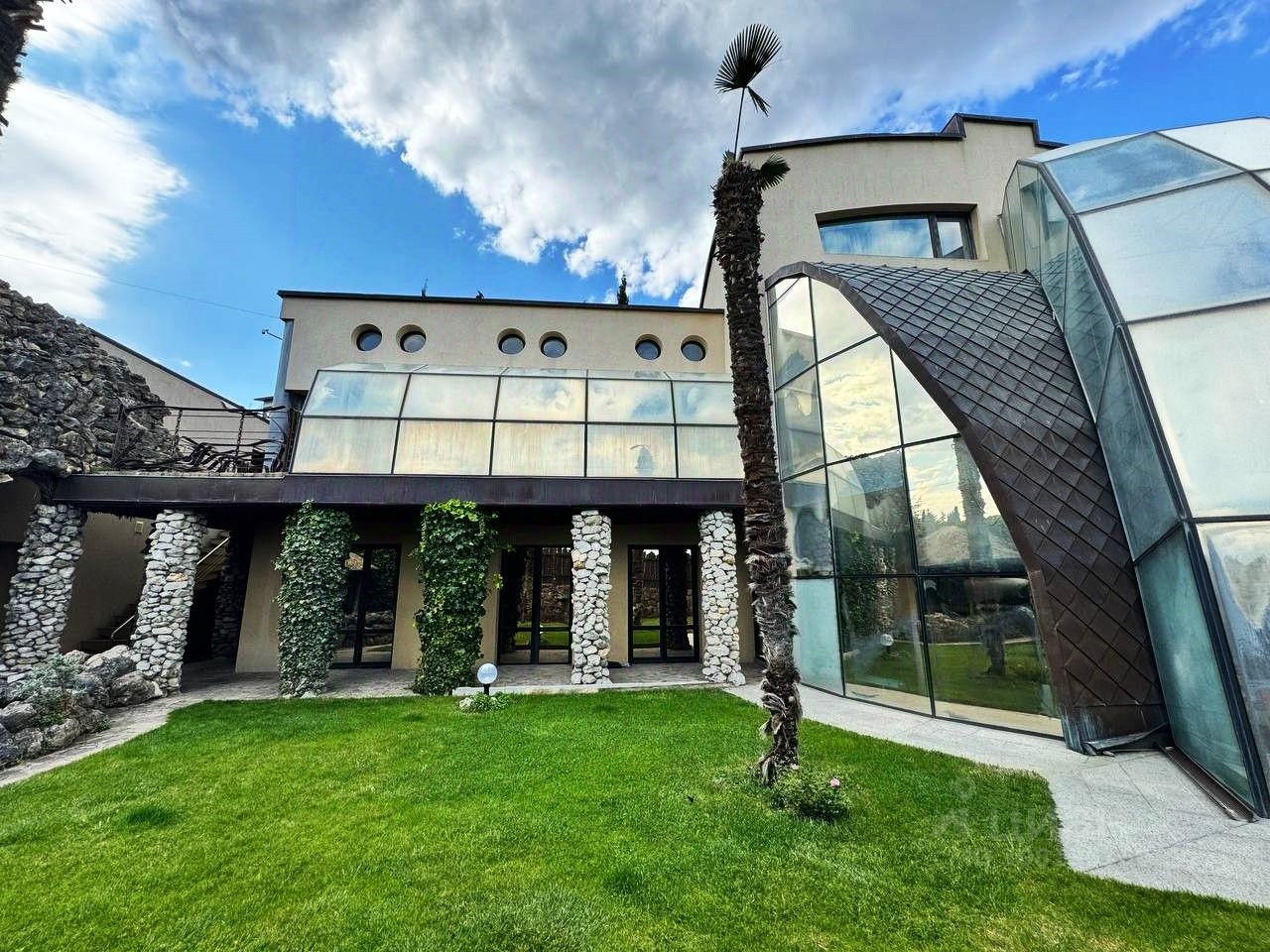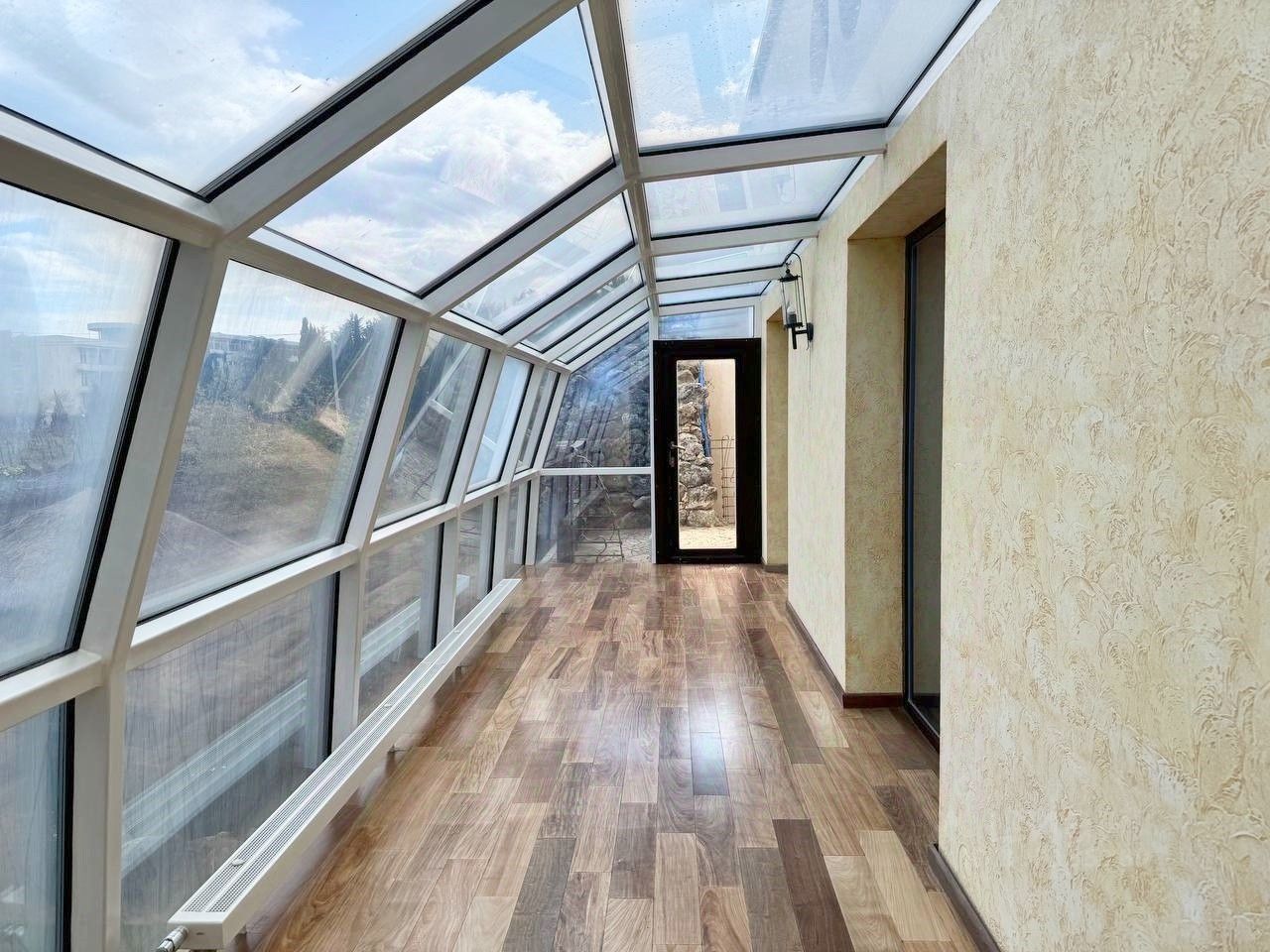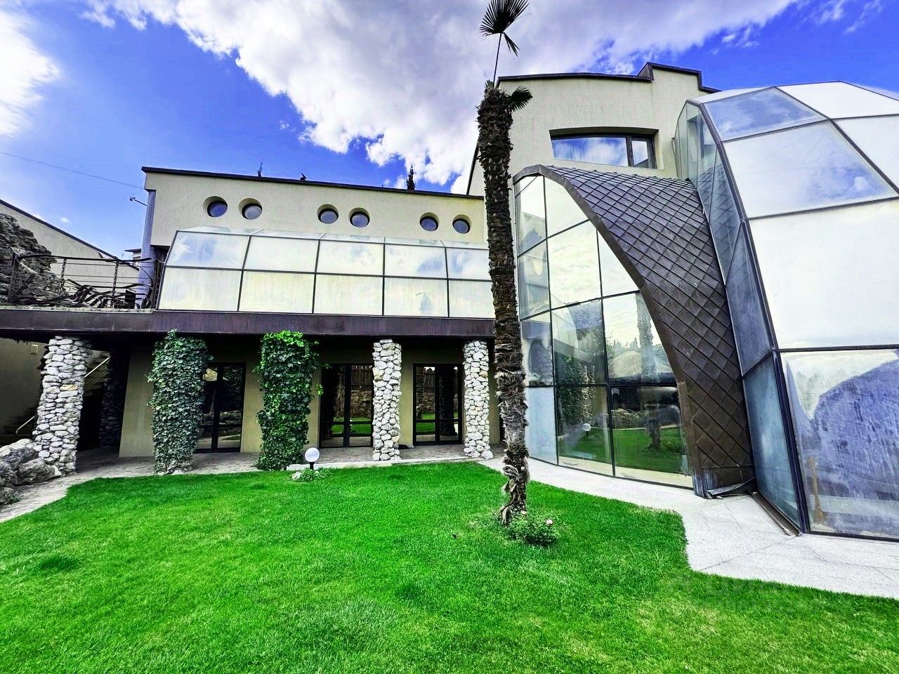 Вашему вниманию предлагается воплощенная в жизнь идея панорамного дома в г. Ялта, пгт. Ливадия Уникальный дом с панорамными окнам и возможностью обозревать звездное небо, видом на виноградники и море. Общая площадь дома 474,4 м2, расположен на земельном участке площадью 1214 м2, отдельно стоящее двухэтажное здание гаража на два автомобиля, сауна с комнатой отдыха, санузлом, общей площадью 144,6 м2. На территории расположен бассейн с морской водой, две беседки, пруд с карпами Кои, выполнен ландшафтный дизайн. Первый этаж дома состоит из прихожей, большого зала-гостиной с панорамным остеклением, санузел, кухня-толовая, спальня, кинозал. На втором этаже уютно расположились мастер спальня с гардеробной и санузлом, две раздельных спальни с общим санузлом, выход на балкон. На мансардном этаже расположен кабинет. Домовладение также включает себя автономные гостевые комнаты с отдельным входом, состоящие из кухни, санузла, спален. Дом выполнен из материалов, наиболее подходящих к данному климату стены ракушечник, крыша - медь, полы тропическое дерево Айпе. На фасаде здания окна защищены стеклопакетами с мембраной ''теневое зеркало''.