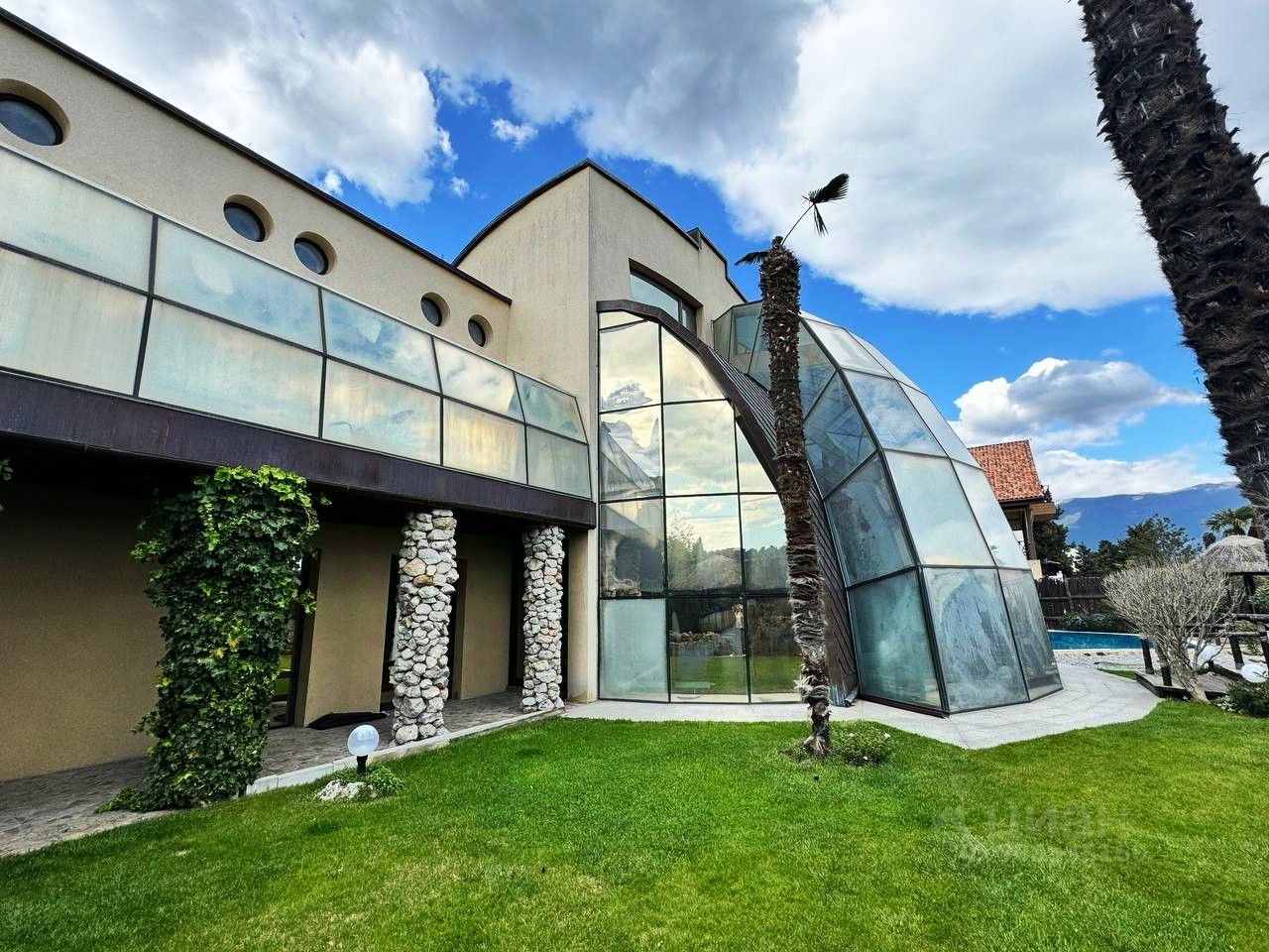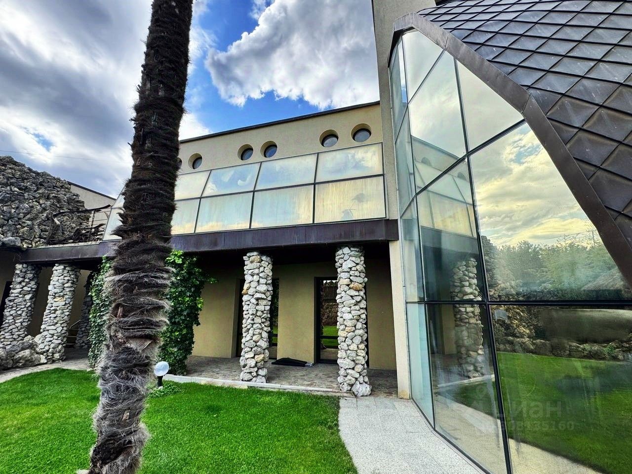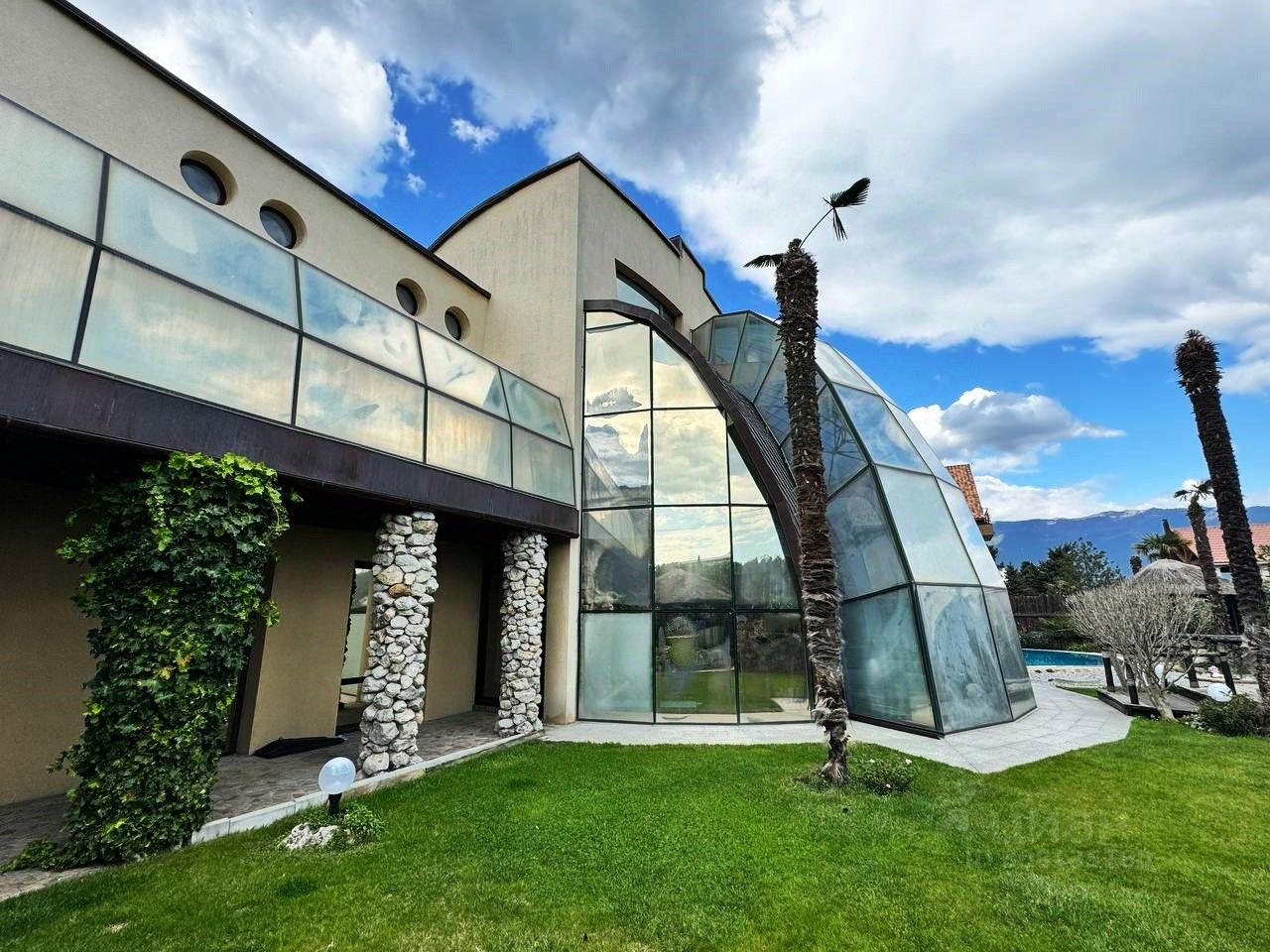 Вашему вниманию предлагается воплощенная в жизнь идея панорамного дома в г. Ялта, пгт. Ливадия Уникальный дом с панорамными окнам и возможностью обозревать звездное небо, видом на виноградники и море. Общая площадь дома 474,4 м2, расположен на земельном участке площадью 1214 м2, отдельно стоящее двухэтажное здание гаража на два автомобиля, сауна с комнатой отдыха, санузлом, общей площадью 144,6 м2. На территории расположен бассейн с морской водой, две беседки, пруд с карпами Кои, выполнен ландшафтный дизайн. Первый этаж дома состоит из прихожей, большого зала-гостиной с панорамным остеклением, санузел, кухня-толовая, спальня, кинозал. На втором этаже уютно расположились мастер спальня с гардеробной и санузлом, две раздельных спальни с общим санузлом, выход на балкон. На мансардном этаже расположен кабинет. Домовладение также включает себя автономные гостевые комнаты с отдельным входом, состоящие из кухни, санузла, спален. Дом выполнен из материалов, наиболее подходящих к данному климату стены ракушечник, крыша - медь, полы тропическое дерево Айпе. На фасаде здания окна защищены стеклопакетами с мембраной ''теневое зеркало''.