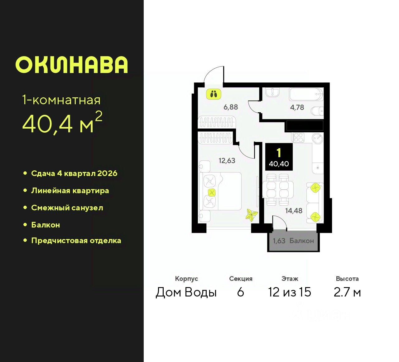 Однокомнатная квартира от застройщика с предчистовой отделкой в ЖК ''Окинава'' на 12 этаже. Общая площадь: 40.4 кв.м., жилая: 12.63 кв.м., площадь просторной кухни-столовой: 14.48 кв.м. Все окна выходят на одну сторону. В квартире один балкон, один совмещенный санузел. Высота потолков 2.7 м.