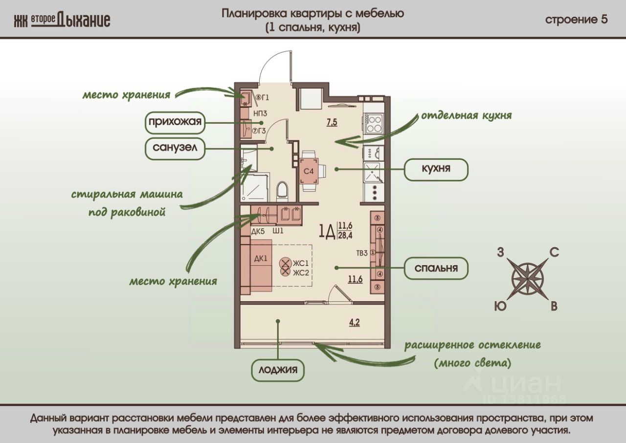 Оцените эту однокомнатную квартиру с функциональной жилой зоной. Сохранение максимума полезной жилплощади за счет отсутствия ''мертвых'' зон вроде коридоров и проходов. Общая площадь 28.4 м2. Грамотное зонирование данной планировки по достоинству оценит каждый. Всё пространство условно поделено на 4 части (зона отдыха, кухня, прихожая, санузел). Гостиная площадью 19,1 м2 комфортная как для проживания, так и встречи гостей. При этом отдельная кухонная зона составляет 7,5 м2. При входе располагается встроеннная ниша для хранения верхней одежды. Данное планировочные решение подходит для проживания не только одного, но и нескольких членов семьи. Квартира, куда хочется возвращаться, отдыхать и проводить время с родными и близкими!