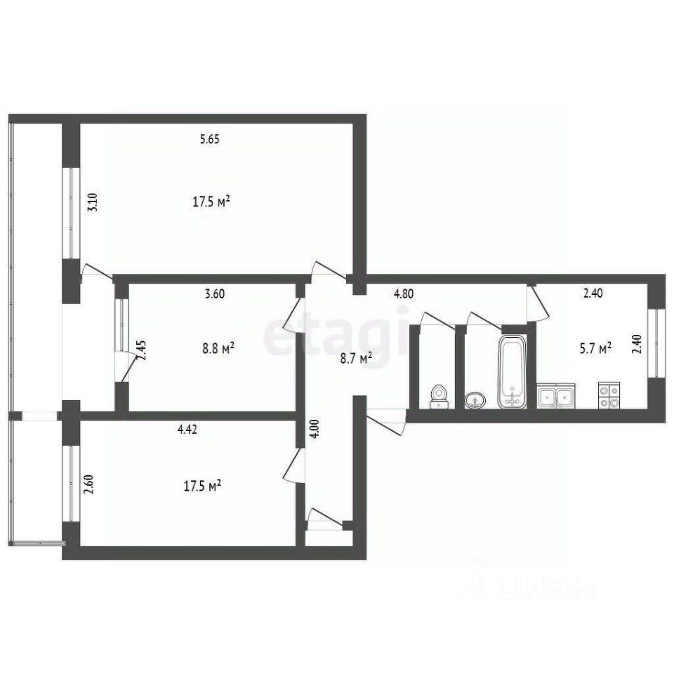 Площадь 55,4 кв. м (без учета балкона 2,4 кв.м. и лоджии 1,3 кв.м). Жилая площадь 37,8 кв.м., кухня 5,7 кв.м. Лоджия застекленная, балкон нет. Находится на 4 этаже пятиэтажного дома. Планировка распашонка (расположение комнат по обе стороны коридора напротив друг друга). Окна выходят на две противоположные стороны дома: во двор и на улицу. Квартира светлая и просторная, комнаты изолированные. Центральное отопление и водоснабжение. Санузел раздельный. Сделан косметический ремонт. Чистый подъезд, хорошие соседи. Благоустроенный отдельный двор, детская и спортивная площадка.