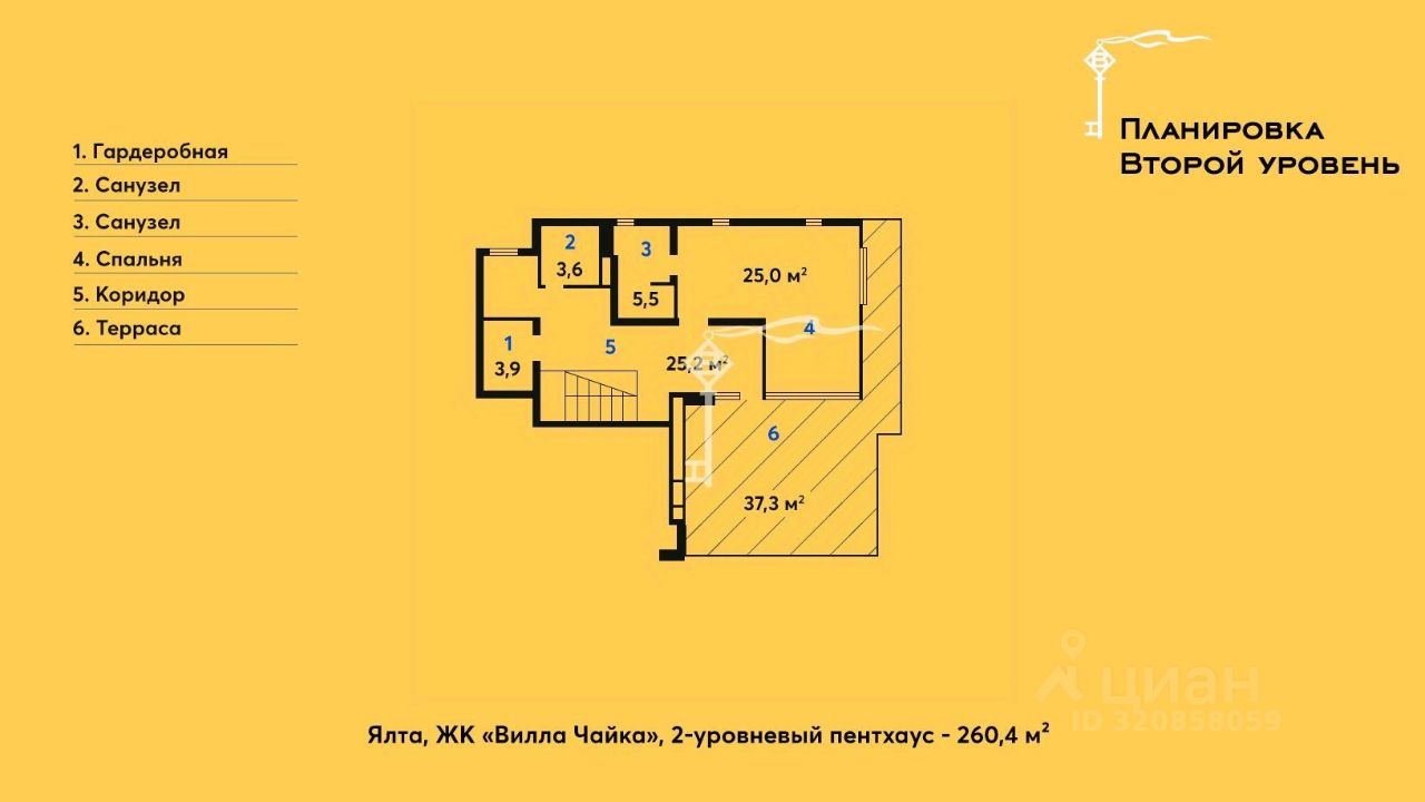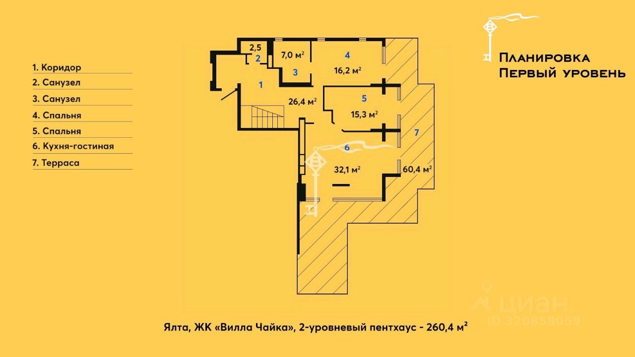 Площадь пентхауса с террасами 260,4 м², внутренняя - 162,7 м².