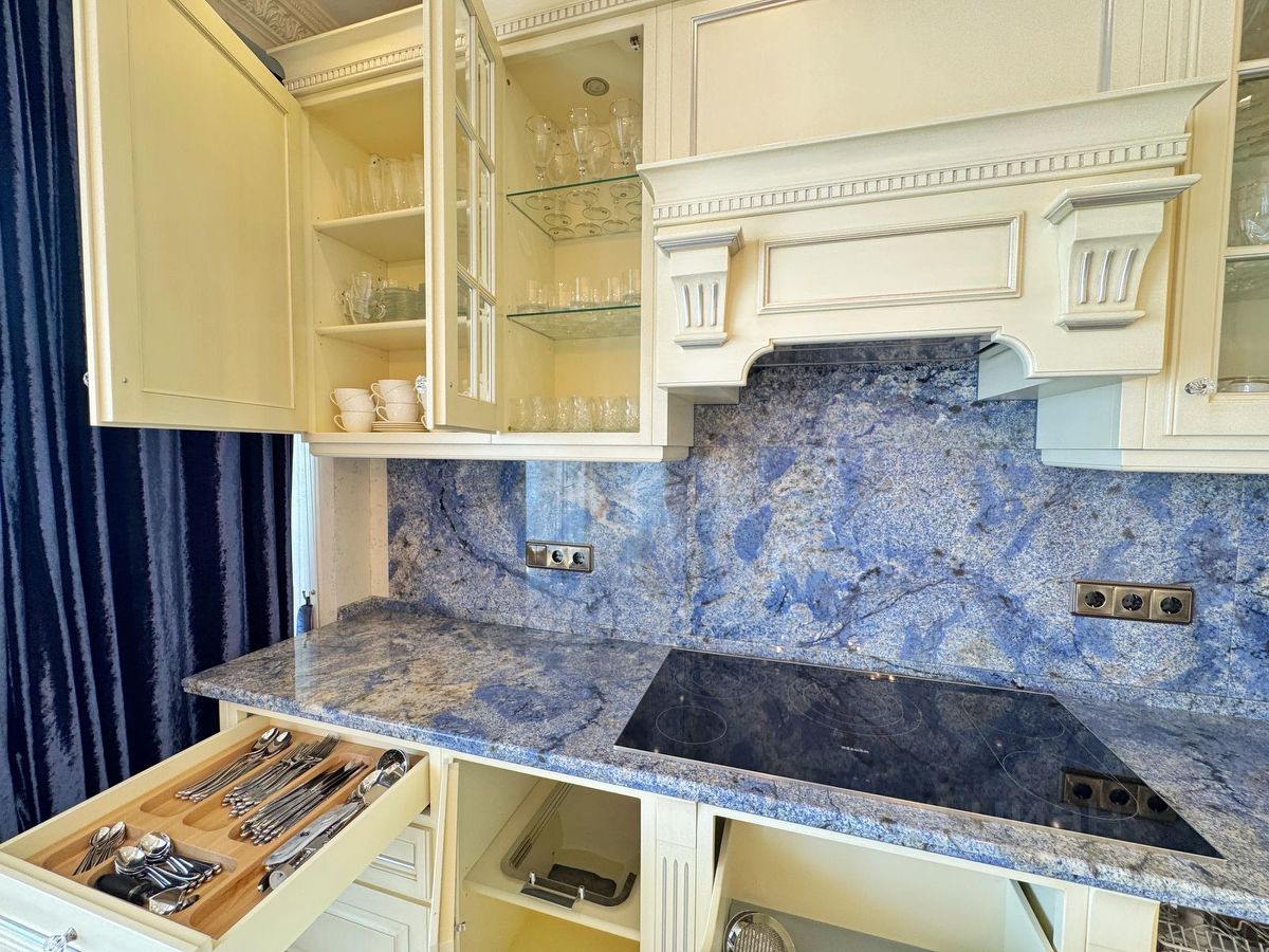 Апартамент абсолютно новый, в нём никто не проживал. Отделка выполнена только из натуральных и премиальных материалов: •бразильский голубой гранит •мрамор нескольких оттенков •оникс •натуральное дерево