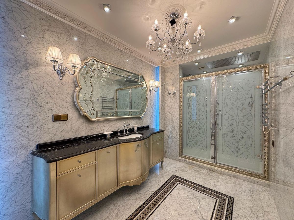 Дополнительные преимущества: •Система тёплого пола в зонах с мраморной отделкой •Индивидуальная система кондиционирования •Полностью укомплектованная кухня: посуда и техника — всё новое, ни разу не использовалось •Новые постельные принадлежности •Осталось только установить телевизоры — и можно сразу заезжать и жить.