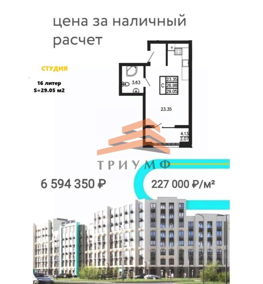 Указанная студия продается за наличный расчет и является рекламным предложением, имеются в продажи 1,2,3 комнатные квартиры на разных этажах и разной площадью, мы расскажем вам какие существуют программы и подберем наиболее выгодную, а также организуем поездку на строительную площадку, чтобы вы увидели все этапы строительства.