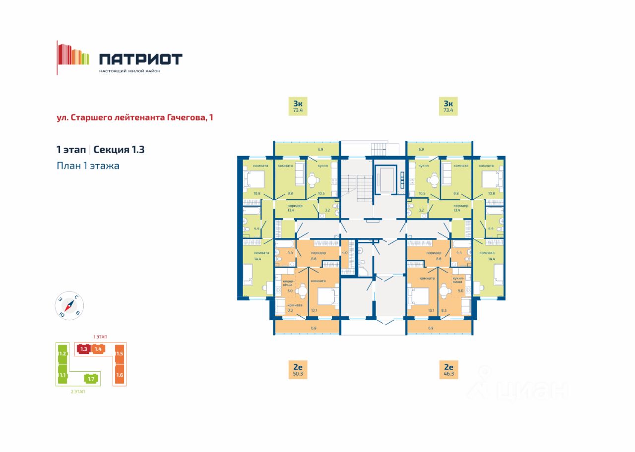 О первом этапе: Адрес: ул. Гачегова, 1. Этажность: 8-10 этажей. Срок сдачи: II кв. 2026 г. - III кв. 2026 г.