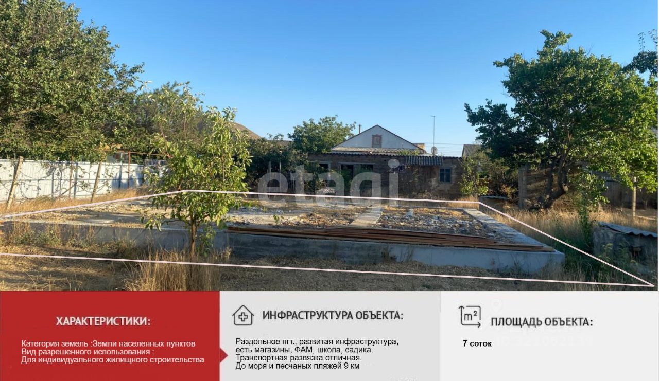 Продается участок ИЖС площадью 7 сот, расположенный в 15 минутах езды от чистого благоустроенного пляжа.