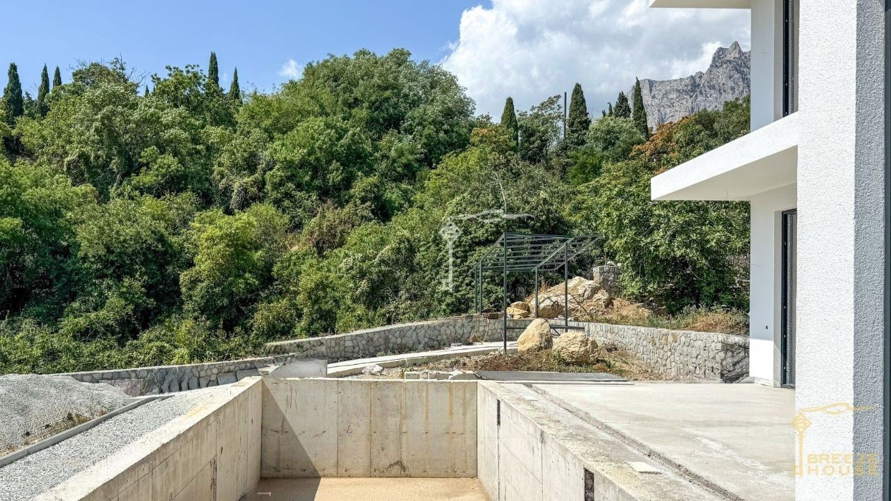 Дом выполнен в стиле хай-тек, с панорамным остеклением и просторными террасами. Из каждой комнаты открываются захватывающие виды на Черное море и гору Ай-Петри.