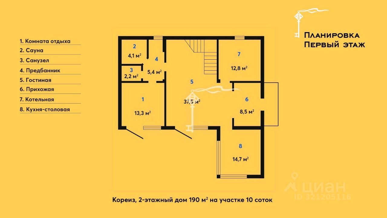 На первом этаже : прихожая, сауна, санузел, котельная, комната отдыха или спальня, кухня-столовая, просторная гостиная с выходом на террасу 40 м² и к бассейну.