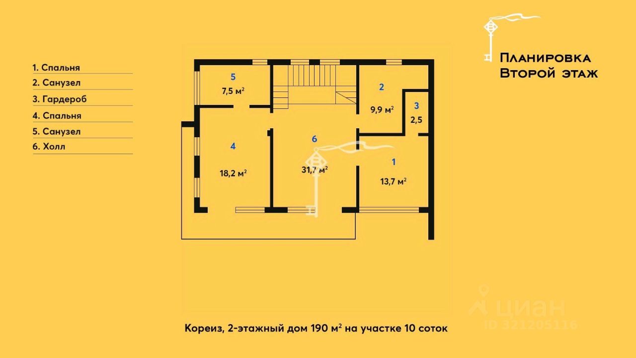 На втором этаже: две спальни с выходом на балкон, два санузла, гардеробная, холл.