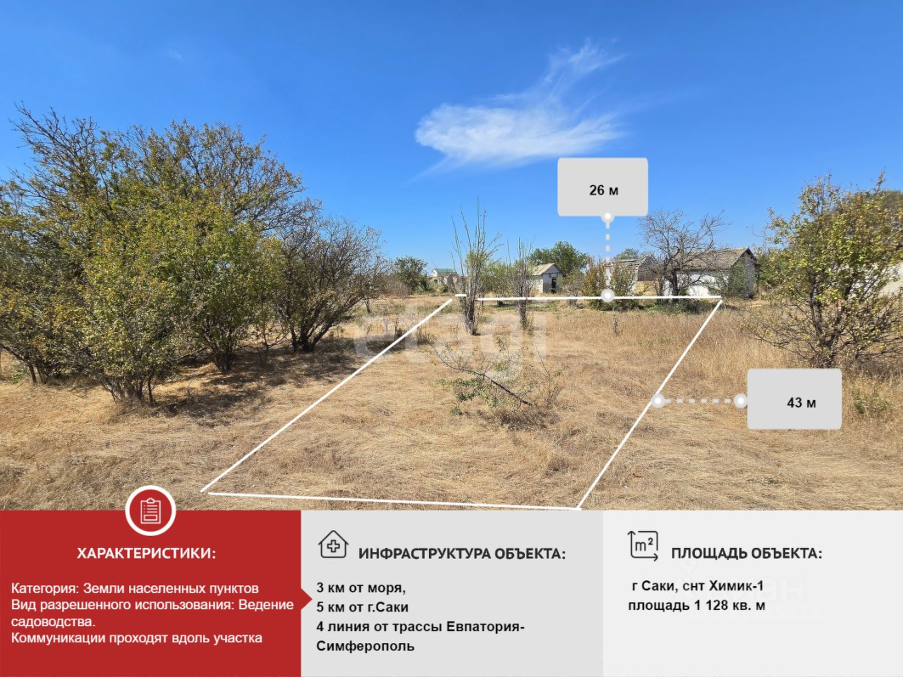 Продаётся уникальный земельный участок в городе Саки, расположенный на улице Заводской. Площадь участка составляет 11,2 сотки и находится всего в 3 км от песчано-галечных пляжей, где вы сможете наслаждаться солнцем и морем. Участок расположен на четвёртой линии от трассы Симферополь-Евпатория.