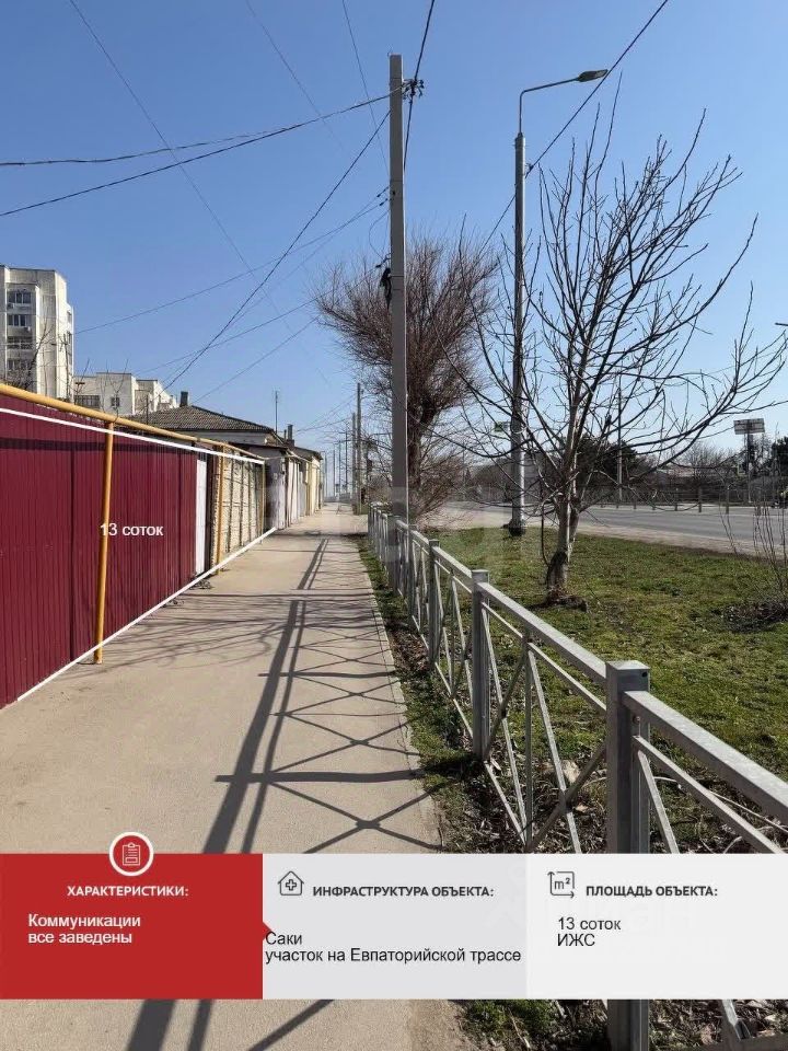 Продается земельный участок в городе Саки . Площадь земельного участка 13 соток , участок угловой ,расположен на ул.Евпаторийское шоссе . Можно использовать под коммерцию , хорошие подъездные пути и проходное место. На участке есть строения: жилой дом , времянка. К участку асфальтированной подъезд , все коммуникации на участок заведены : электричество, вода, центральная канализация. В пешей доступности автостанция, центральный рынок,магазины,аптеки. Расстояние до моря 7 км ,в пешей доступности набережная Сакского лечебного озера . Участок можно использовать и для жизни ,а также под коммерцию. Наша комиссия 79000 р.+1% от стоимости объекта, но не менее 70000 р.