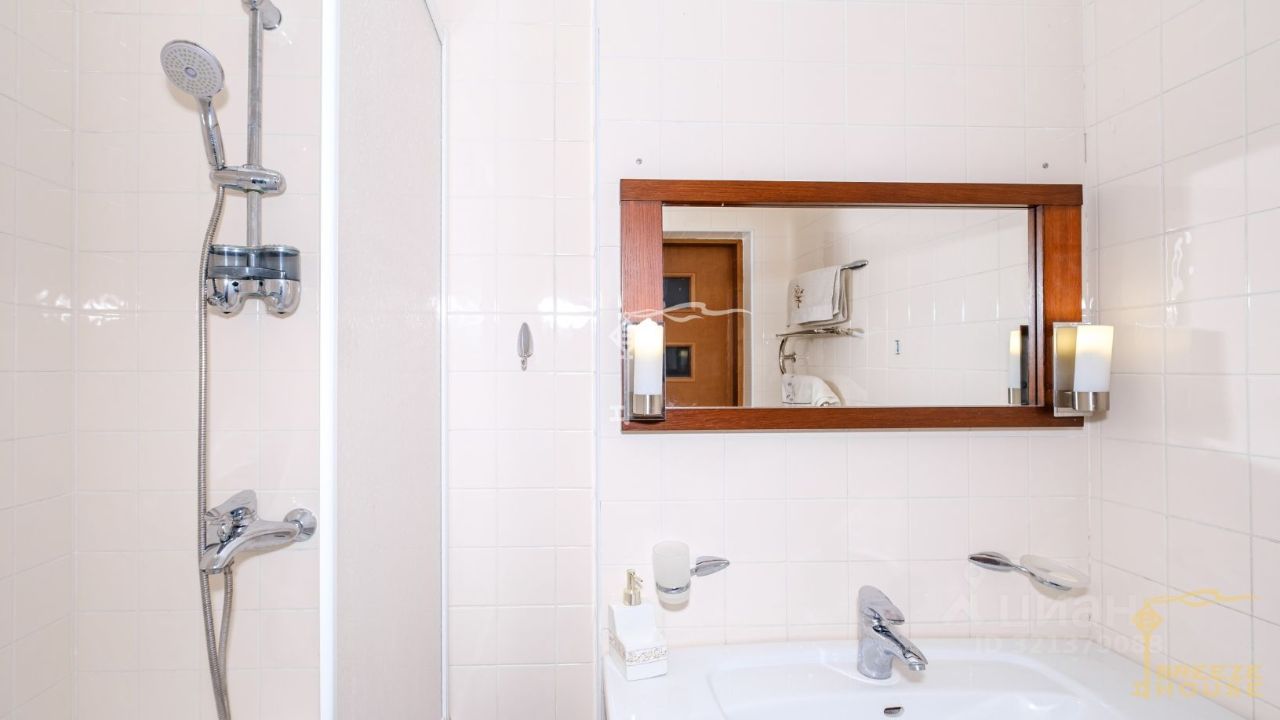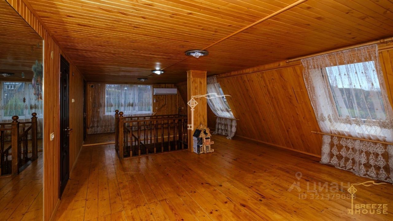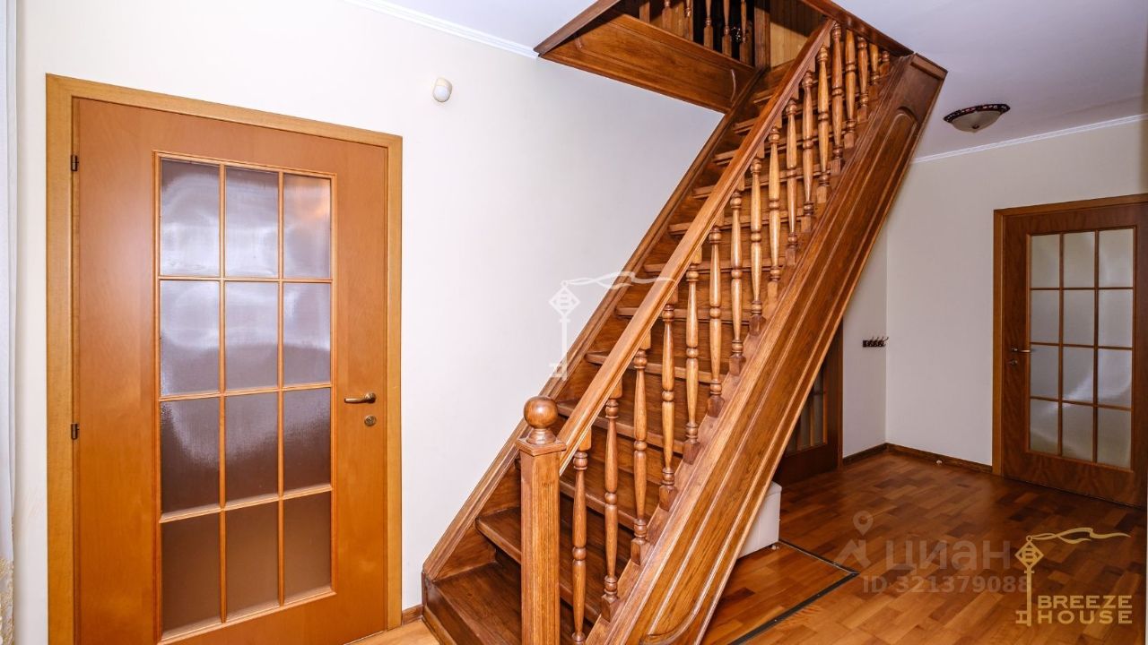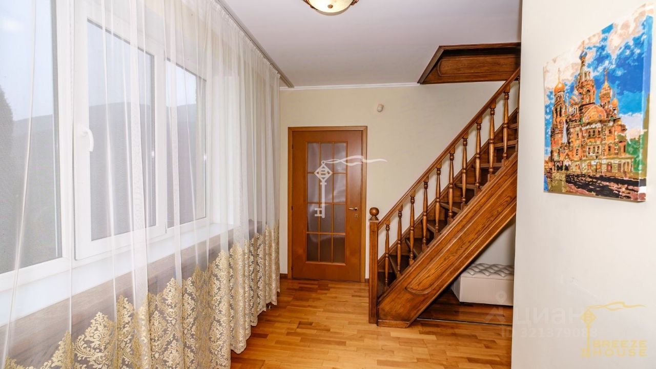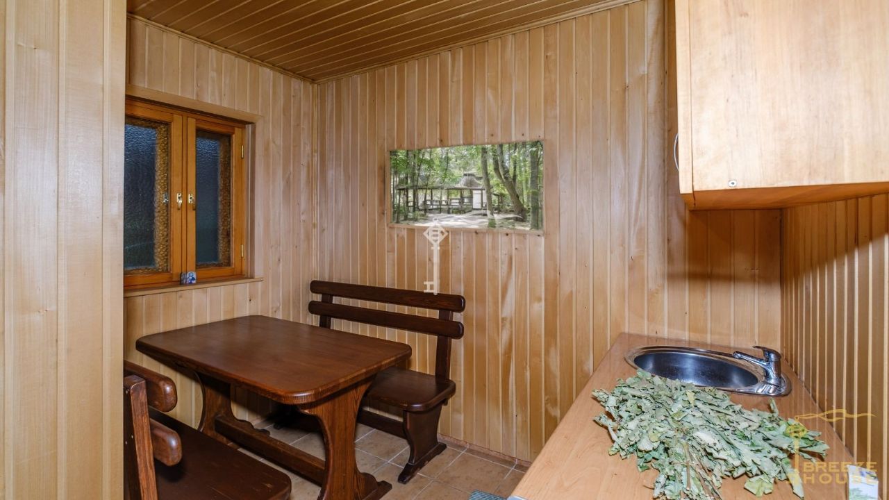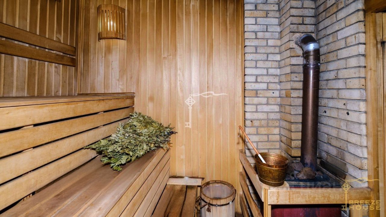 Просторная гостиная с камином, шесть спален, гардеробная, кухня и четыре санузла, а также три просторные комнаты на мансарде. На цокольном этаже находятся: сауна, технические помещения и въезд в гараж.