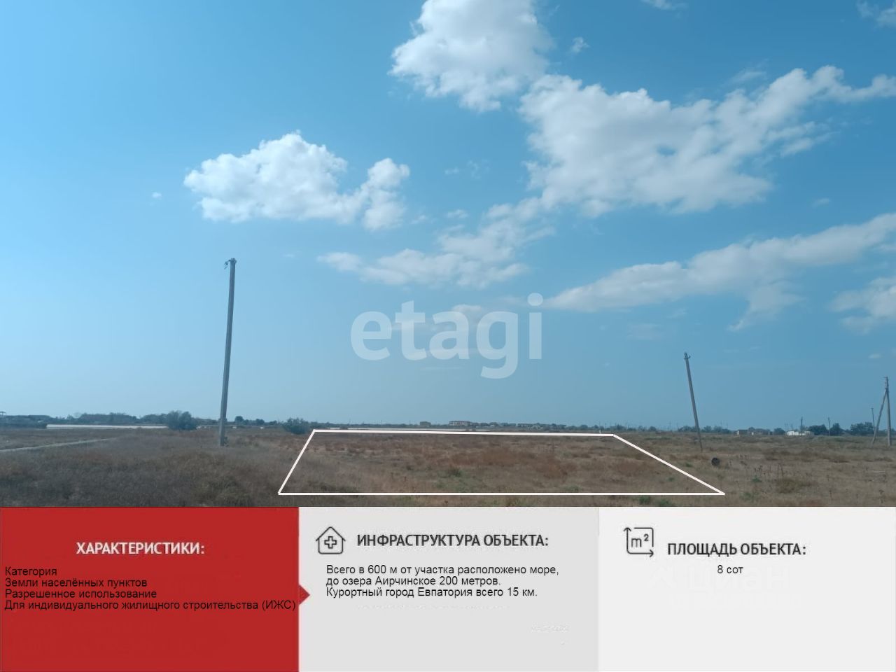 Участок оформлен под ВРИ Индивидуальное жилое строительство , что предоставляет все возможности для возведения жилого дома с полноценным фундаментом и пропиской. Газовая распределительная станция неподалеку от земельного участка, электрические столбы по границе. Всего в 600 м от участка расположено море, до озера Аирчинское 200 метров. Курортный город Евпатория всего 15 км.