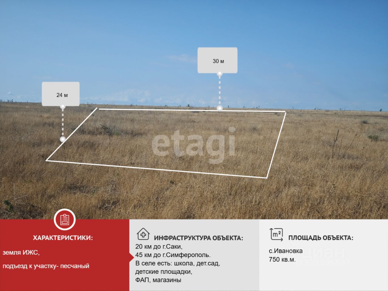 Участок площадью 7,5 соток под ИЖС расположен в перспективном сельском поселении Ивановка вблизи города Саки. Ключевым преимуществом является отличная транспортная доступность: участок находится недалеко от трассы Саки-Севастополь, что обеспечивает круглогодичную связь с ключевыми городами Крыма. До районного центра Саки и морского побережья можно добраться за 20 минут, до Симферополя — за 50 минут.