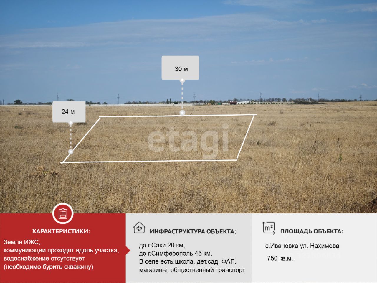 Участок площадью 7,5 соток под ИЖС расположен в перспективном сельском поселении Ивановка вблизи города Саки. Ключевым преимуществом является отличная транспортная доступность: участок находится недалеко от трассы Саки-Севaстополь, что обеспечивает круглогодичную связь с ключевыми городами Крыма. До районного центра, города Саки, дорога занимает 20 минут, до Симферополя — 50 минут, а до морского побережья можно добраться в среднем за 20 минут.
